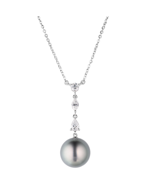 Подвеска Mikimoto выполненная из белого золота 750 пробы с черной жемчужиной южных морей диаметром 12 мм., и тремя бриллиантами формы огранки "КР-57", "Маркиз" и "Груша" массой 0,50 ct. Длина цепочки - 41 см. Вес - 5,06 гр.