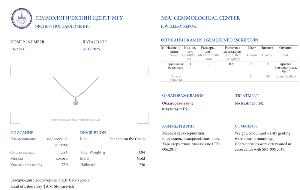 Подвеска на цепочке из белого золота 750 пробы с бриллиантом классической формы огранки "Кр-57" массой 0,31 ct. Цвет - H. Чистота - SI2. Длина цепочки - 50 см. Вес изделия - 3,85 гр. В комплекте прилагается экспертное заключение геммологического центра МГУ.
