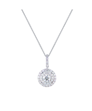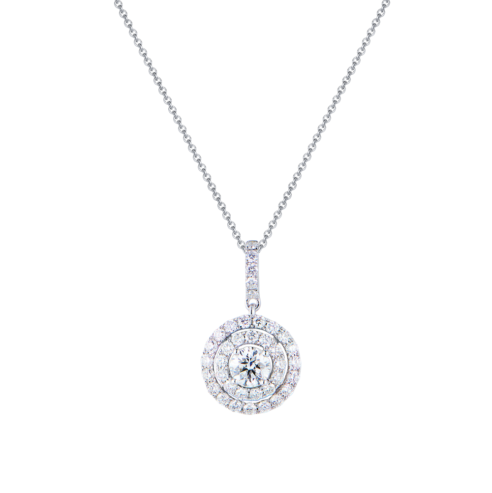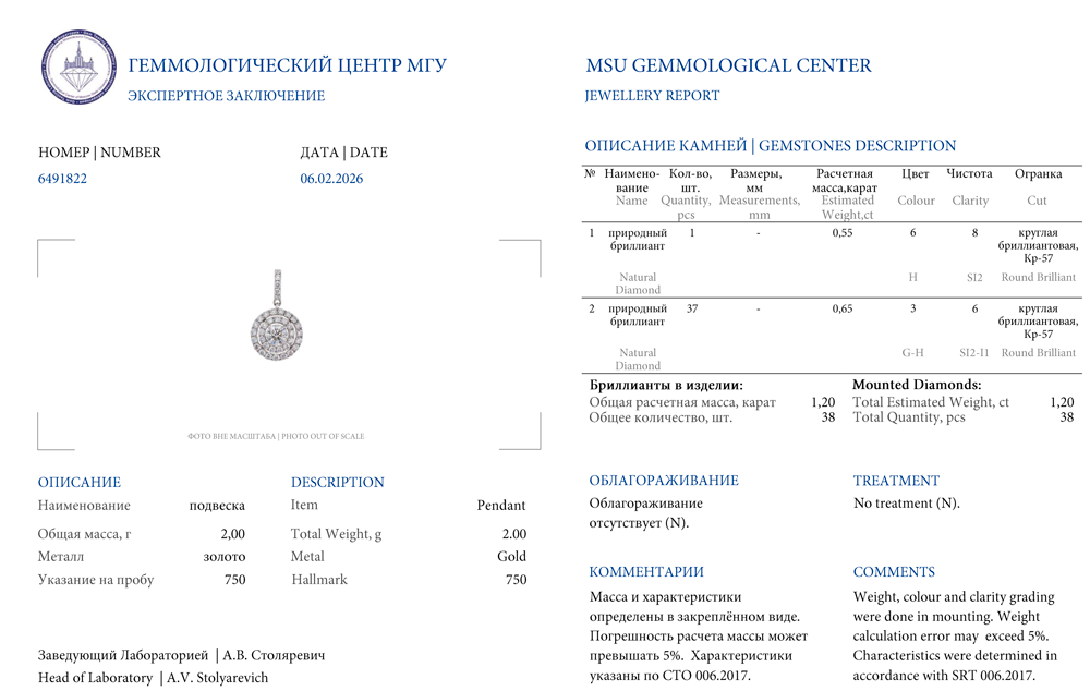 Подвеска, выполненная из белого золота 750 пробы с паве из 37 бриллиантов классической формы огранки G/SI1 общей массой 0,65 ct. 1 бриллиант 0,55 ct. Цвет H. Чистота SI2. Форма огранки "КР-57". Длина цепочки - 48 см. Вес - 3,73 гр. В комплекте прилагается экспертное заключение Геммологического центра МГУ.