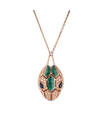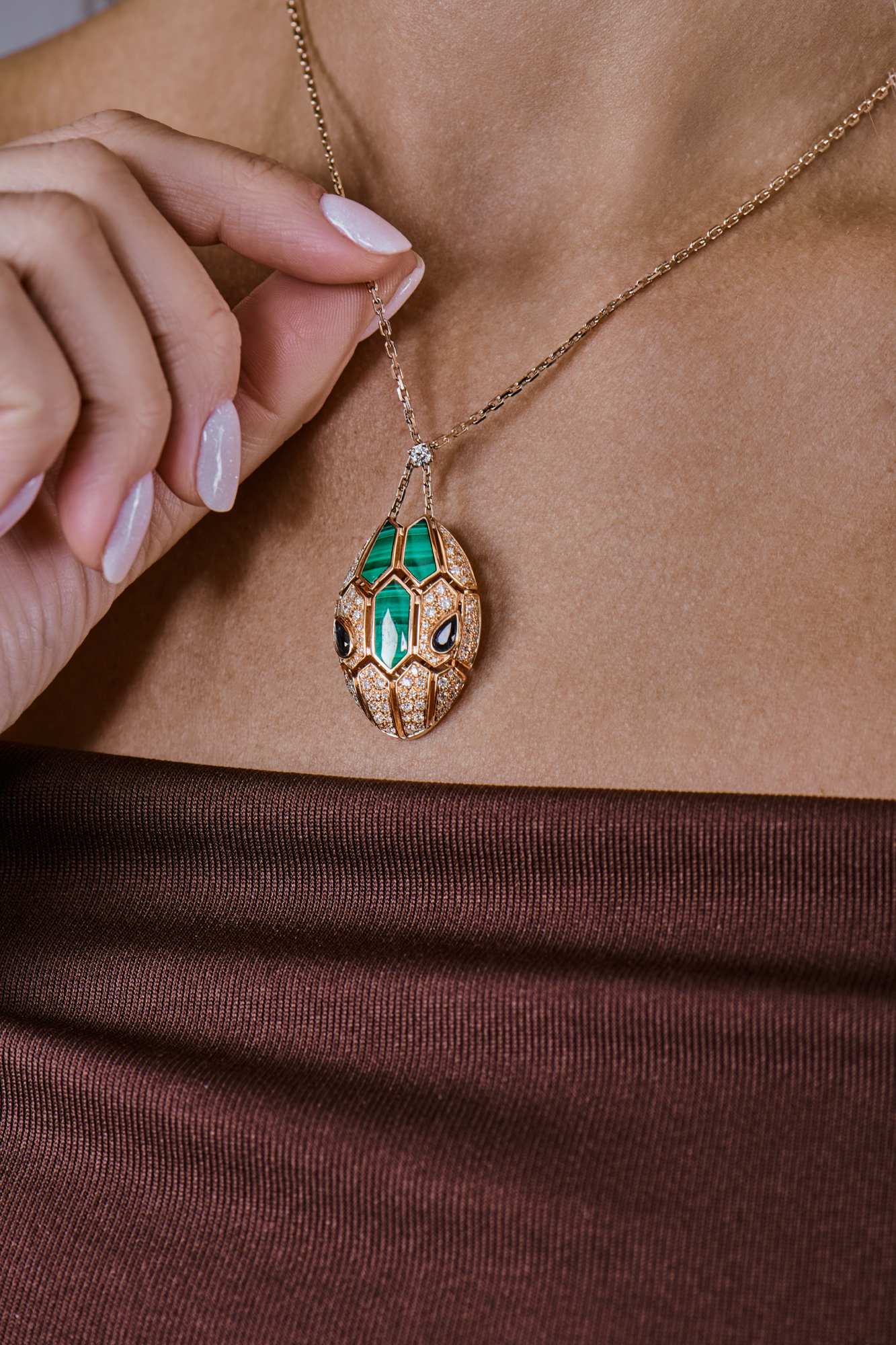 Колье выполненное в стиле Bvlgari коллекции "Serpenti Seduttori" из розового золота 750 пробы с натуральными бриллиантами классической формы огранки общей массой 1,34 ct и вставками из 2 сапфиров и малахита. Длина цепочки 42-46 см. Вес - 16,53 гр.