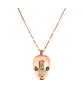 Подвеска выполненное в стиле Bvlgari коллекции "Serpenti Seduttori" из розового золота 750 пробы с бриллиантами классической формы огранки общей массой 0,21 ct и вставками из 2 изумрудов. Размер кулона 23 х 15 мм. Длина цепочки 40-46 см. Вес - 6,30 гр.