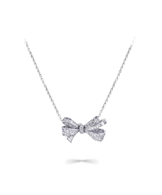 Подвеска выполненная в стиле GRAFF, коллекции " Tilda’s Bow Classic" из белого золота 750 пробы и бриллиантами классической формы огранки "КР-57"и "Багет" общей массой 1,238 ct. Длина цепочки 42 см. Длина регулируется. Вес - 9,55 гр.
