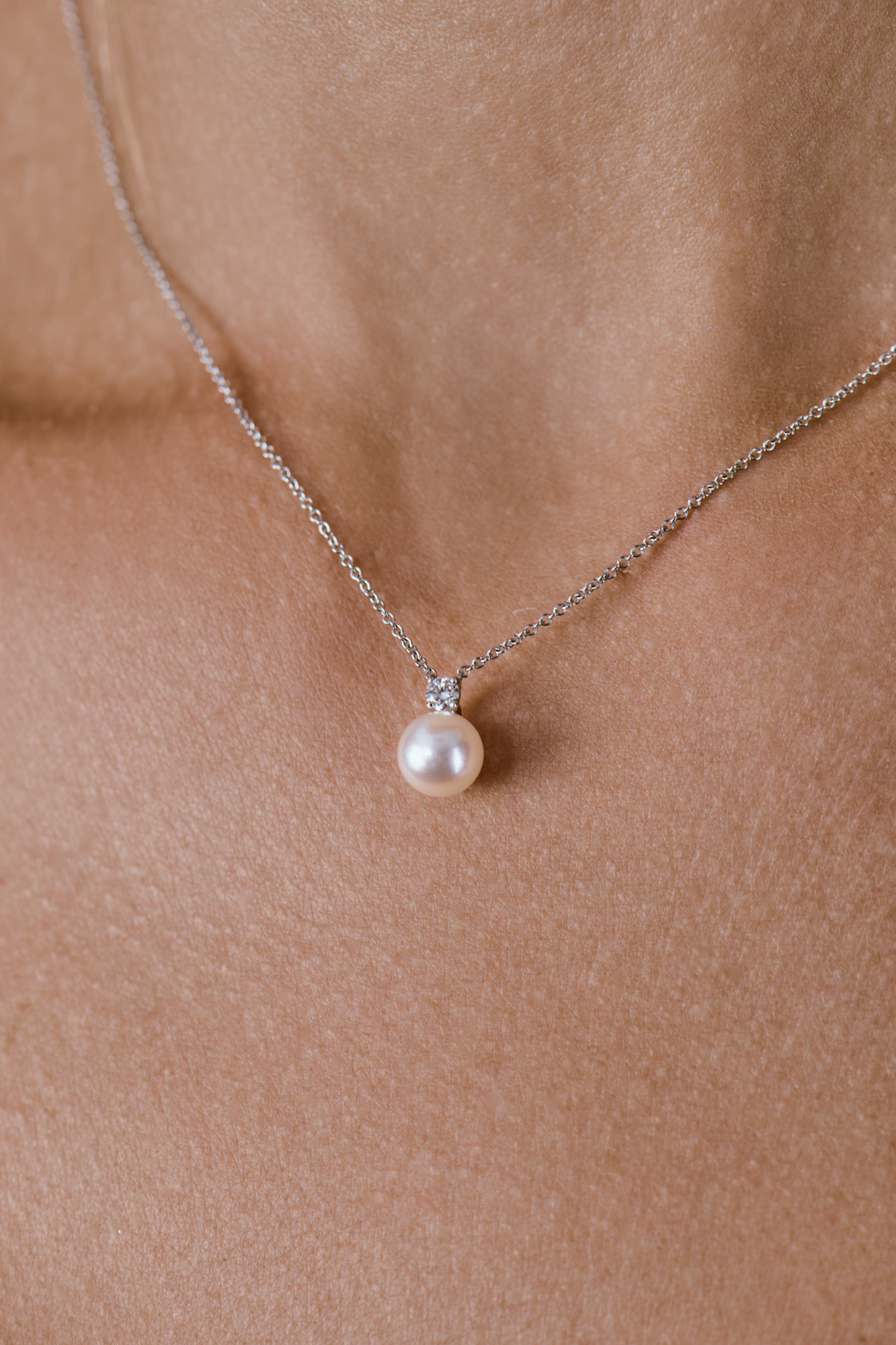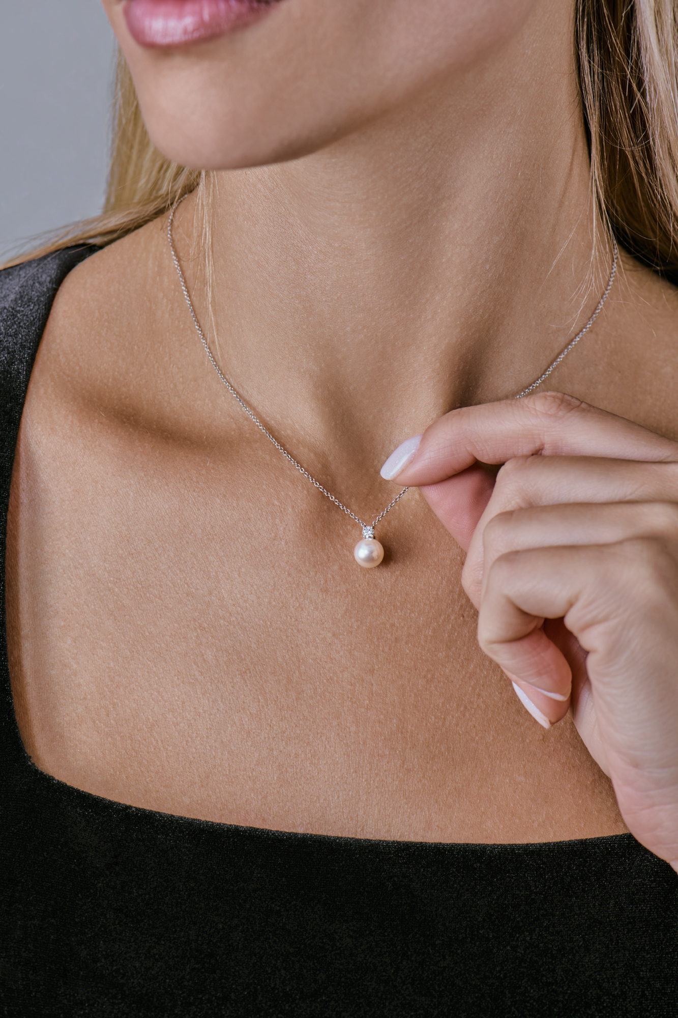 Подвеска Tiffany & Co коллекции "Signature" из белого золота 750 пробы с жемчужиной Акойя, диаметром 7-7,5 мм и круглым бриллиантом массой 0,08 ct.. Цепочка длиной 38 см. Вес - 2,63 гр.