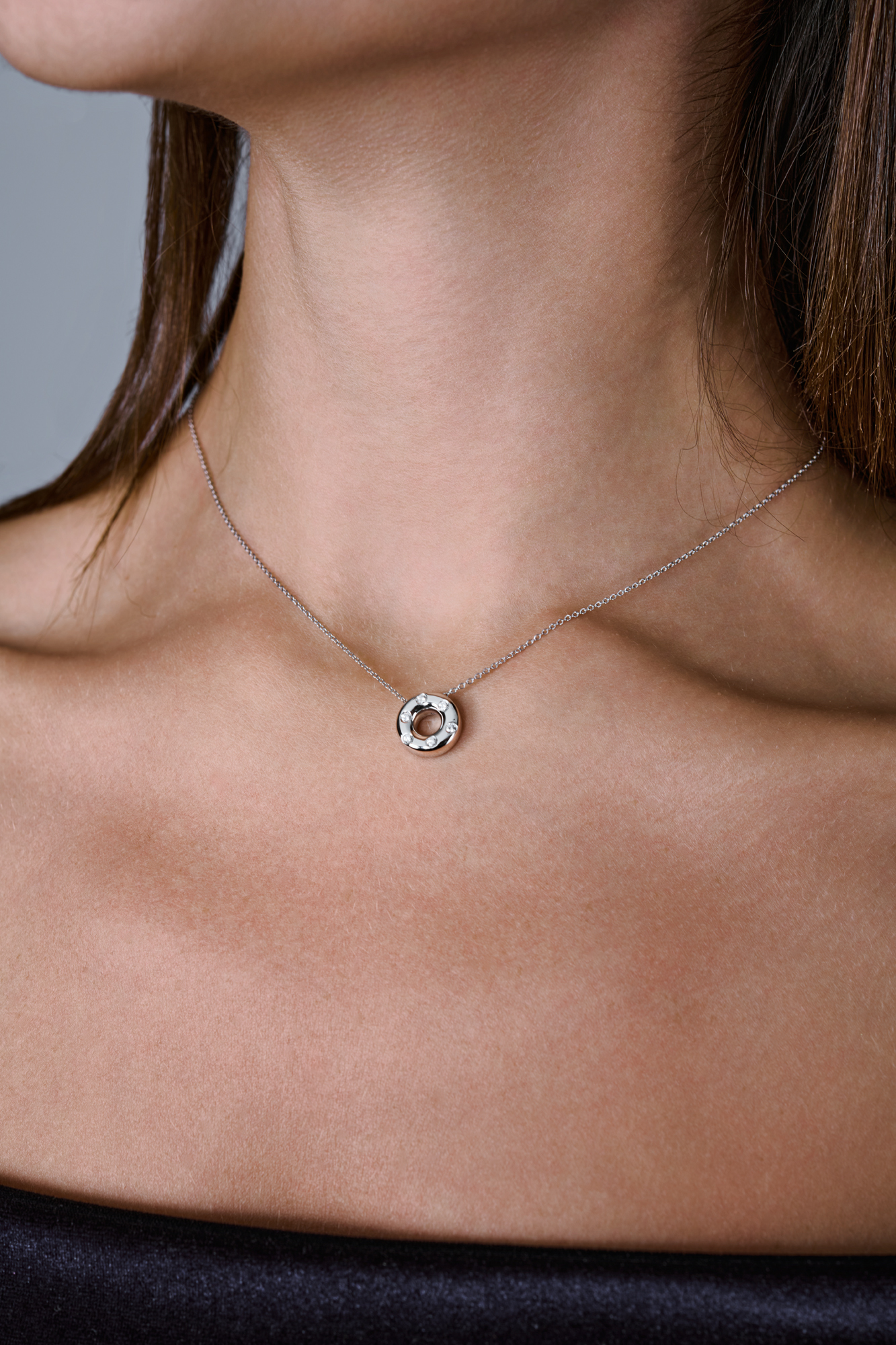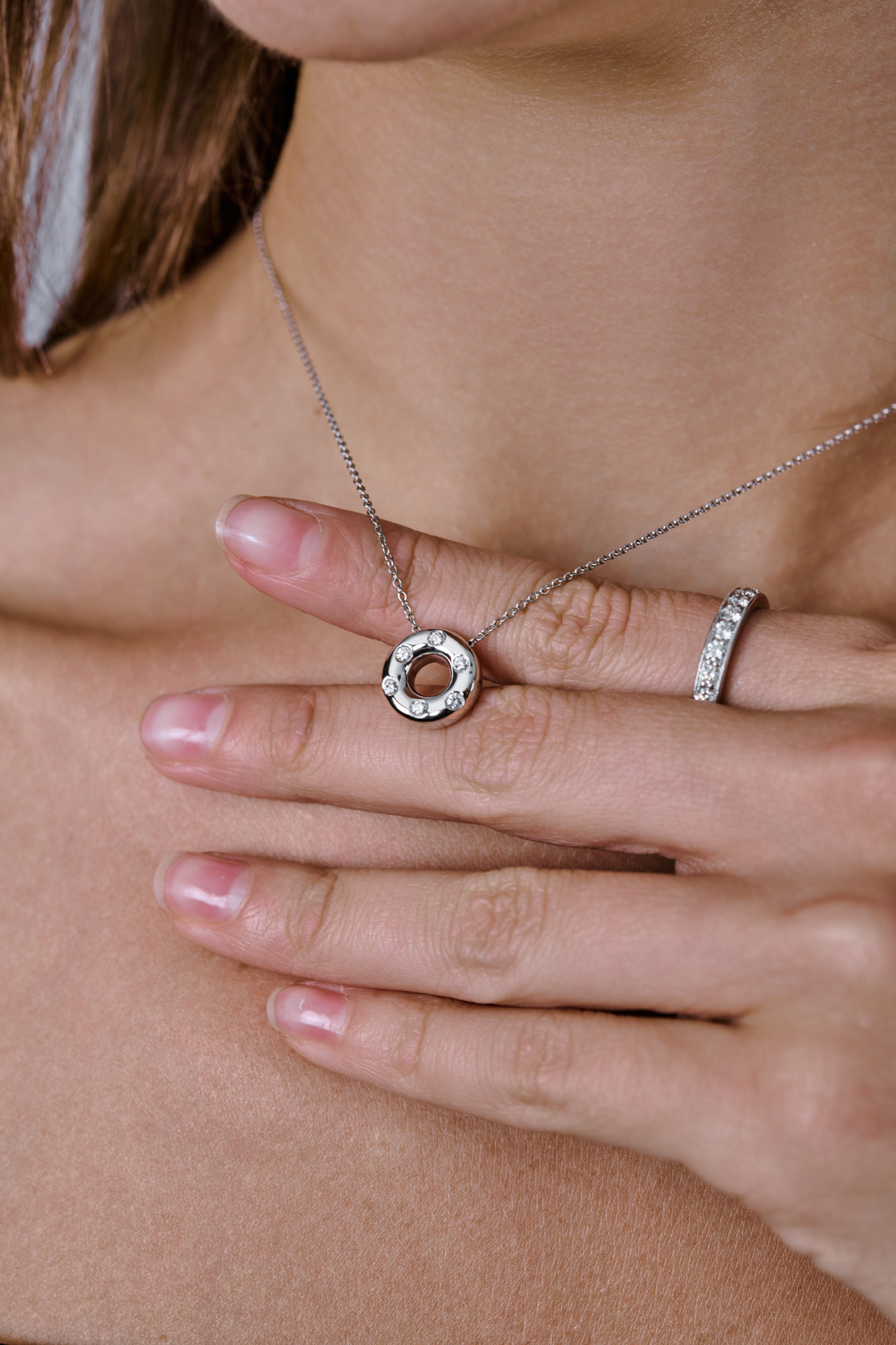 Винтажная подвеска Tiffany & Co коллекции "Etoile" в виде открытого круга из платины 950 пробы и 6 бриллиантов классической формы огранки общей массой 0,18 ct. Диаметр круга 12 мм. Длина цепочки 40 см. Вес 6,90 гр.