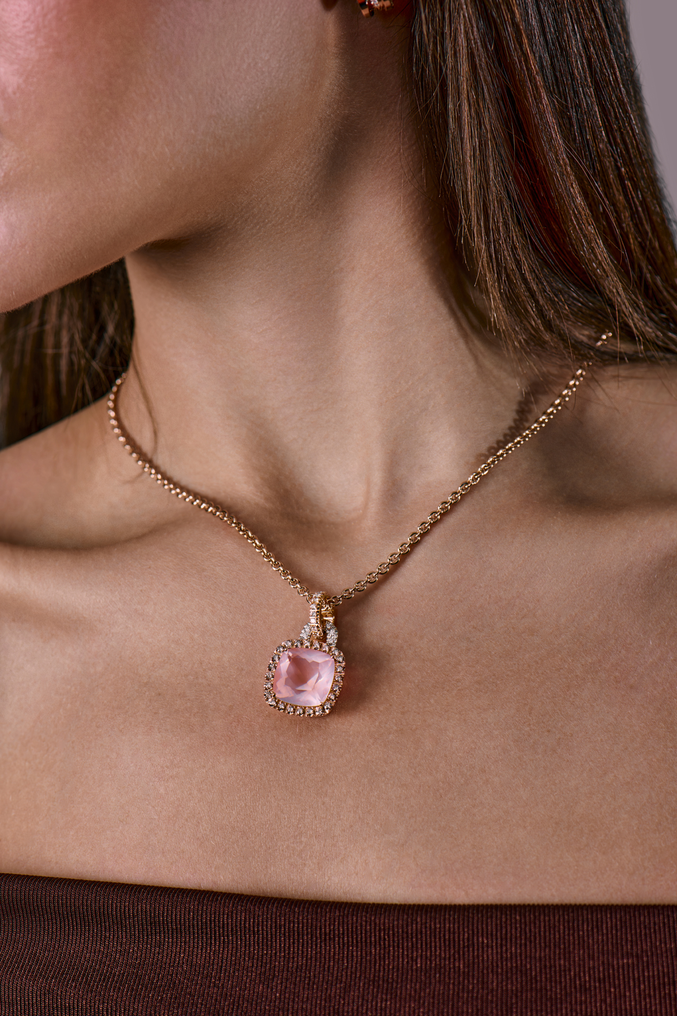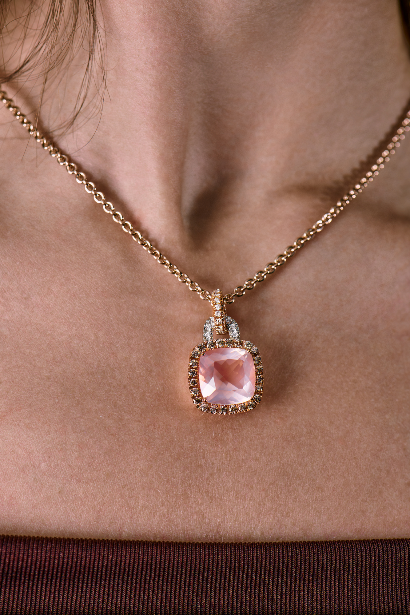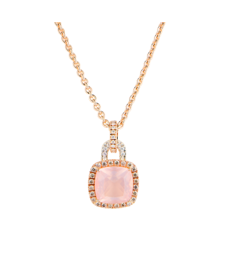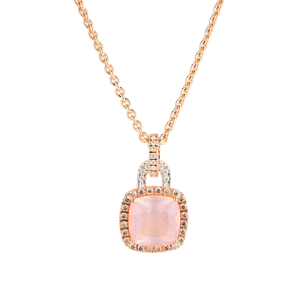Подвеска Valente Milano выполненная из розового золота 750 пробы с натуральным бриллиантами классической формы огранки общей массой 1,1 ct. Розовый кварц массой 13,72 ct. Длина цепочки - 42 см. Вес изделия - 27,11 гр.