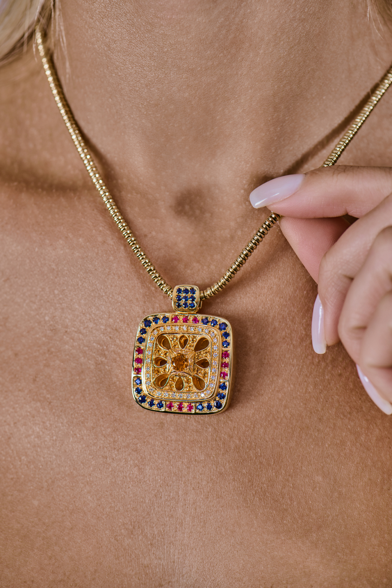 Подвеска Zancan выполненная из желтого золота 750 пробы, бриллиантов классической формы огранки, цитринов, сапфиров, рубинов. Длина цепочки - 38 см. Диаметр подвески - 30 х 30 мм. Вес изделия - 49,01 гр.