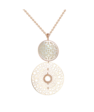 Подвеска (Колье) Zoccai коллекции "Damasco" выполненная из розового золота с вставкой из перламутра и бриллиантов. Диаметр окружности 48 мм. Длина цепочки - 42 см. Вес - 13,60 гр.
