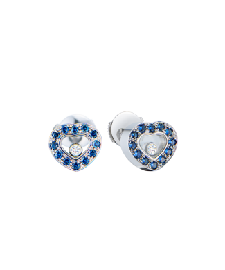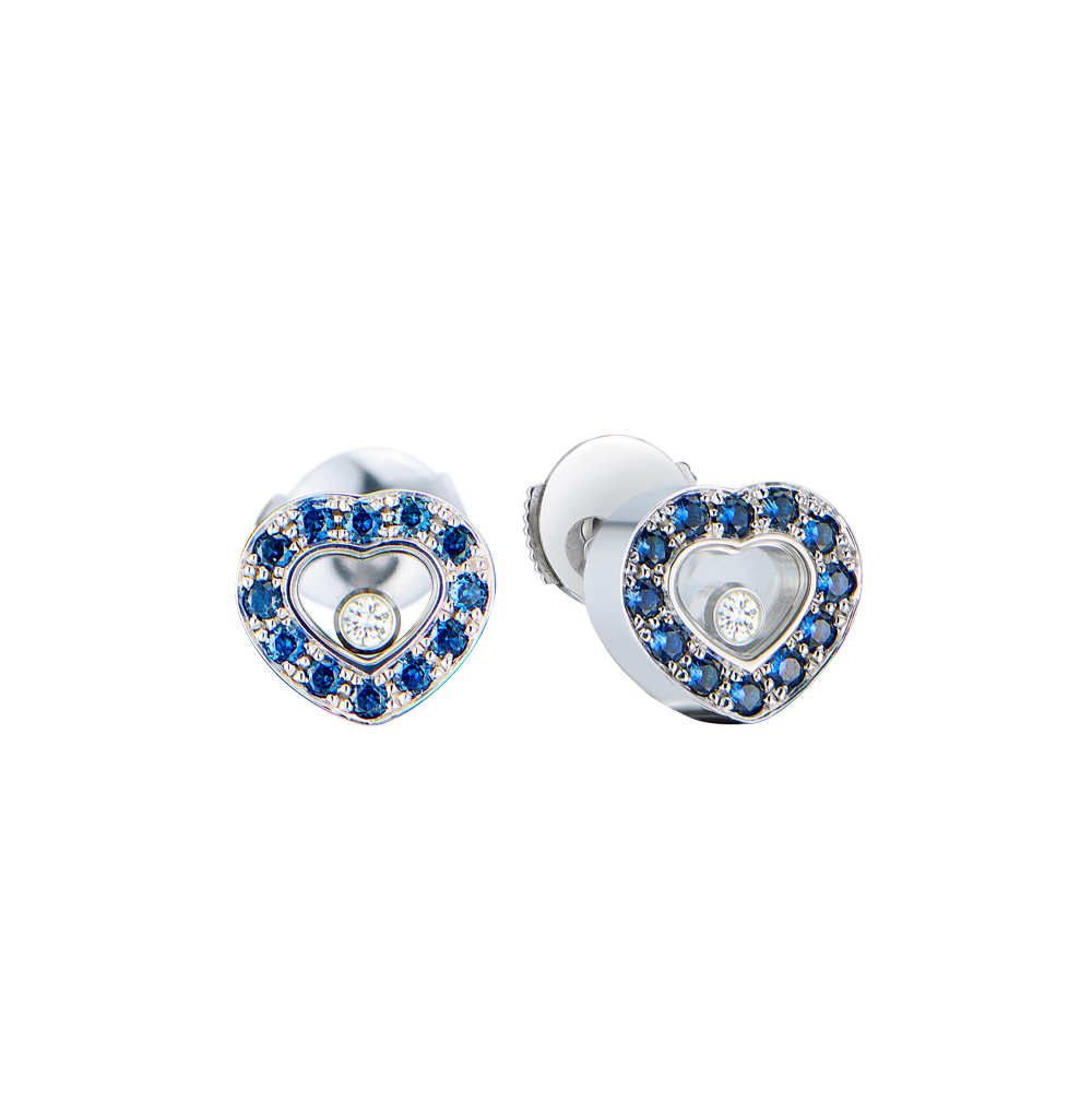 Серьги Chopard коллекции "Happy Diamonds Hearts" выполненные из белого золота 750 пробы с бриллиантами и сапфирами. 2 плавающих бриллианта общей массой 0,11 ct., 24 синих сапфира общей массой 0,43 ct. Размер 10 х 10 мм. Вес - 7,39 гр.