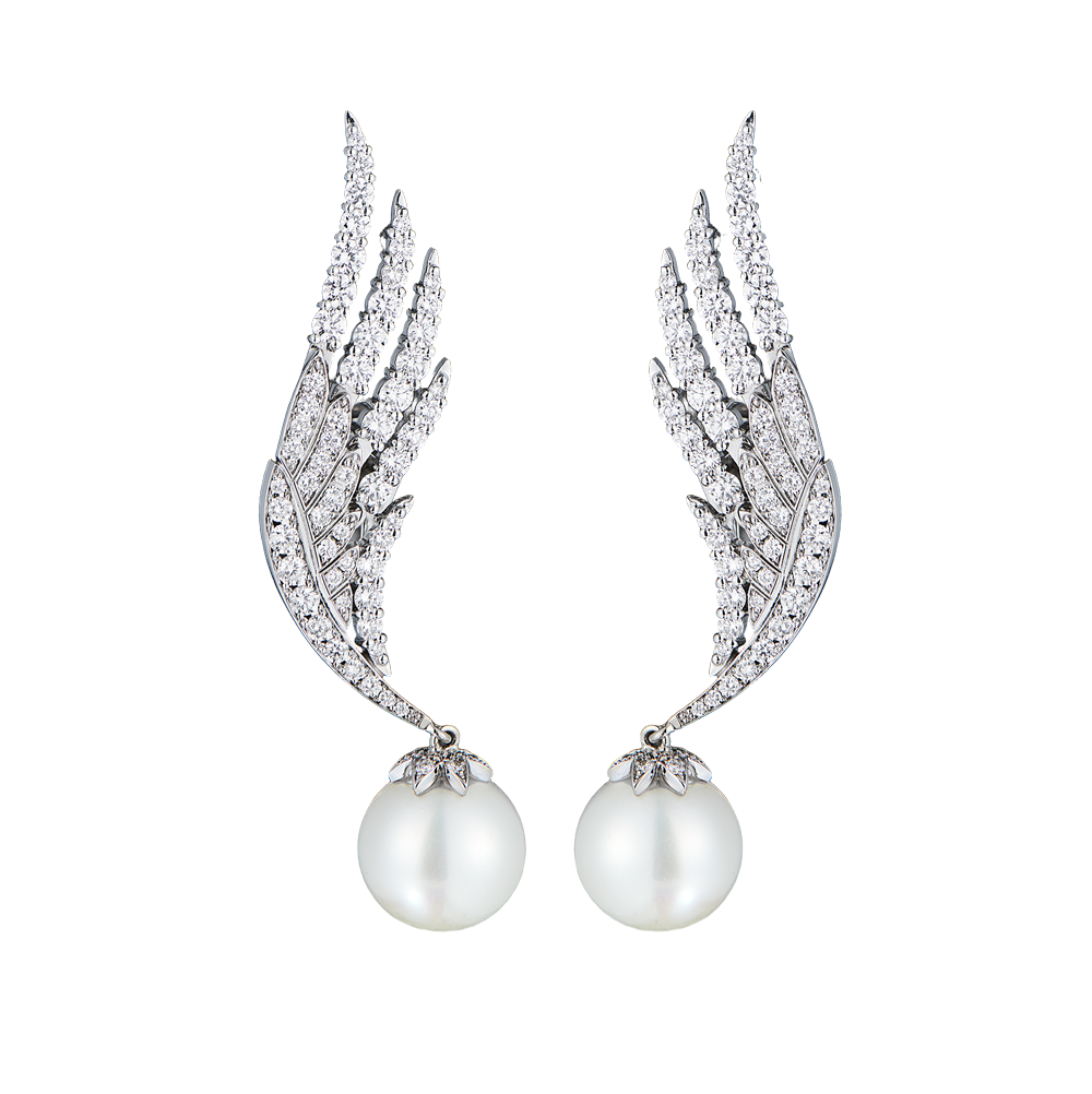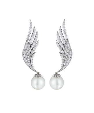 Серьги выполненные из белого золота 750 пробы с натуральным пресноводным жемчугом диаметром 10,30 - 10,50 мм., и 126 бриллиантами классической формы огранки "КР-57" общей массой 2,35 ct (G-H/VS2-SI1). Размер 50 х 11 мм. Вес - 37,40 гр. В комплекте экспертное заключение Геммологического центра МГУ.