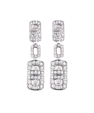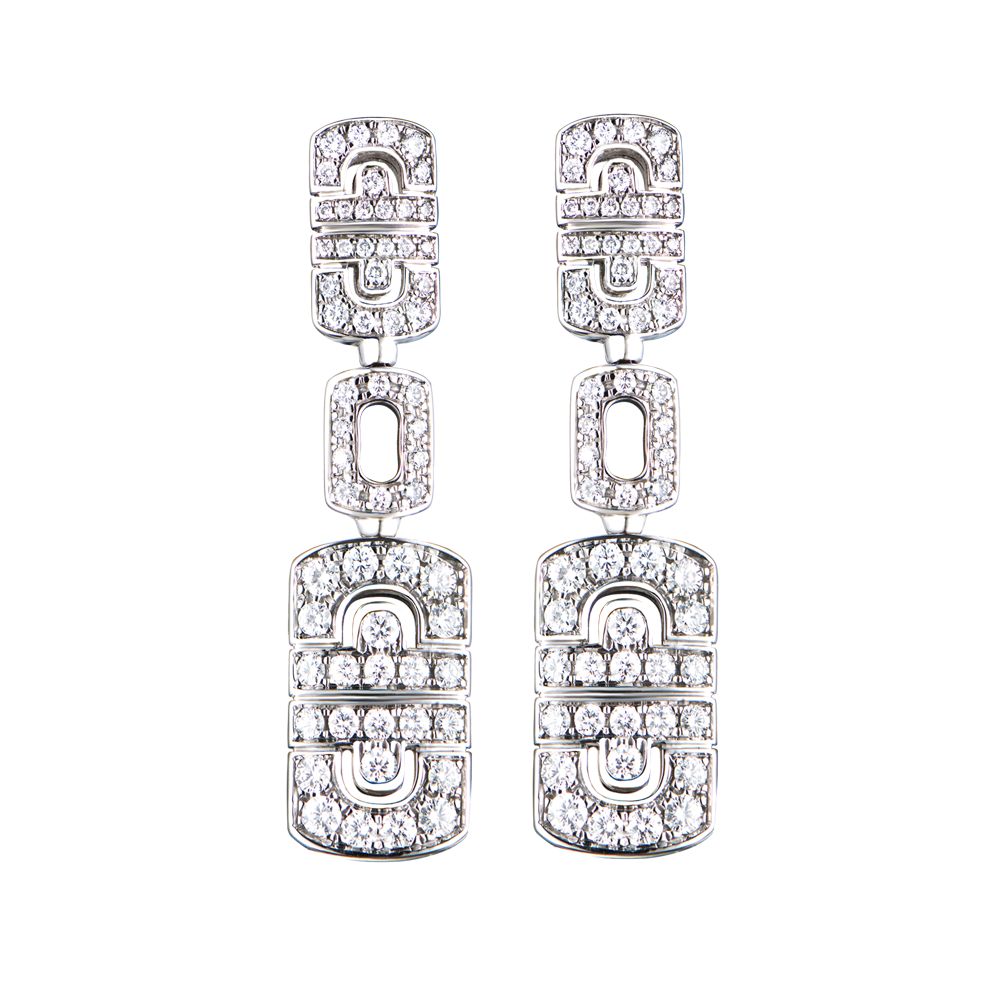 Серьги Bvlgari коллекции "Parentesi Revolution" выполненные из белого золота 750 пробы с 120 бриллиантами классической формы огранки общей массой 2,25 ct. Размер сережек 44 х 11 мм. Вес - 20,15 гр.