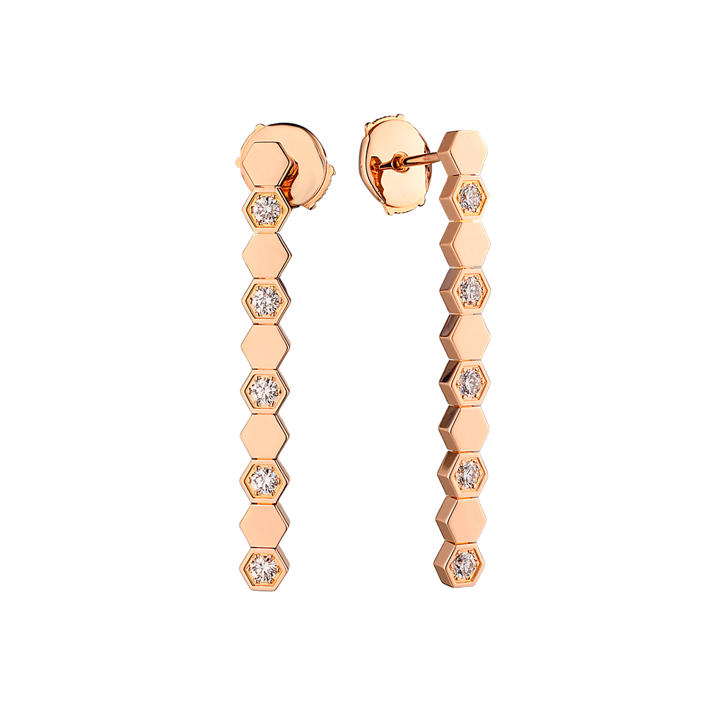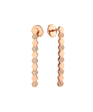 Серьги Chaumet коллекции "Bee de Chaumet" с мотивом пчелиных сот выполнены из розового золота 750 пробы с 10 бриллиантами классической формы огранки общей массой 0,39 ct. G/VS+. Длина сережек - 36 мм. Вес - 5,48 гр.