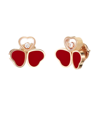 Серьги Chopard коллекции "Happy Hearts" выполненные из розового золота 750 пробы с вставкой из двух плавающих бриллиантов классической формы огранки массой 0,10 сt., а также 4 вставками из сердолика. Размер сережек 14,6 х 13,5 мм. Вес - 4,31 гр. Полный комплект.