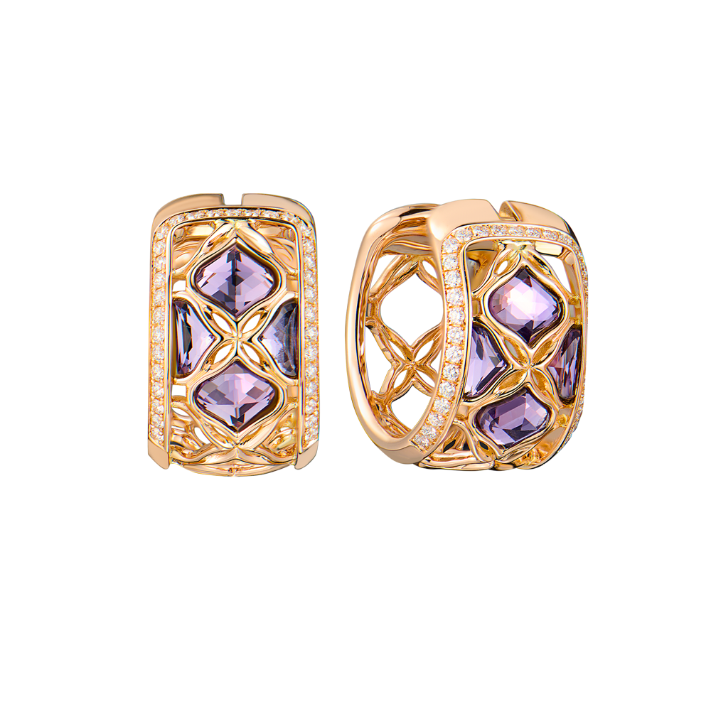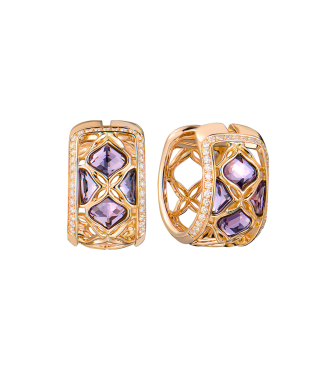 Серьги Chopard коллекции "Imperiale Lace" выполненные из розового золота 750 пробы с 8 аметистами фантазийной формы огранки общей массой 2,24 ct., а также 66 бриллиантами классической формы огранки общей массой 0,45 ct. Размеры 11,8 х 20 мм. Вес - 14,84 гр.