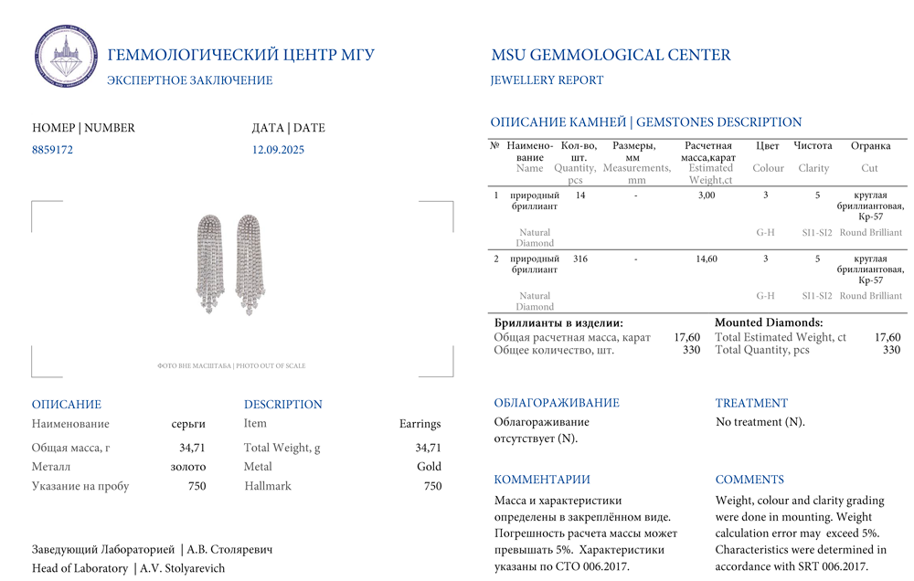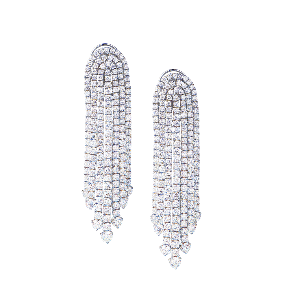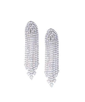 Серьги Crivelli выполненные из белого золота 750 пробы с 330 бриллиантами классической формы огранки общей массой 17,60 ct. Цвет 3. Чистота 5. Размер сережек 73 х 17 мм. Вес - 34,65 гр. В комплекте прилагается экспертное заключение Геммологического центра МГУ.