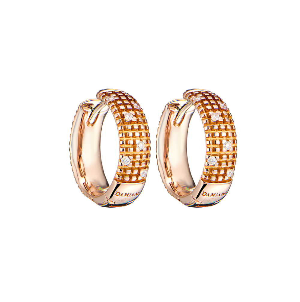 Серьги Damiani коллекции "Metropolitan Dream" выполненный из розового золота 750 пробы с 12 бриллиантами классической формы огранки общей массой 0,09 ct. Диаметр 15 мм. Вес - 5,33 гр.