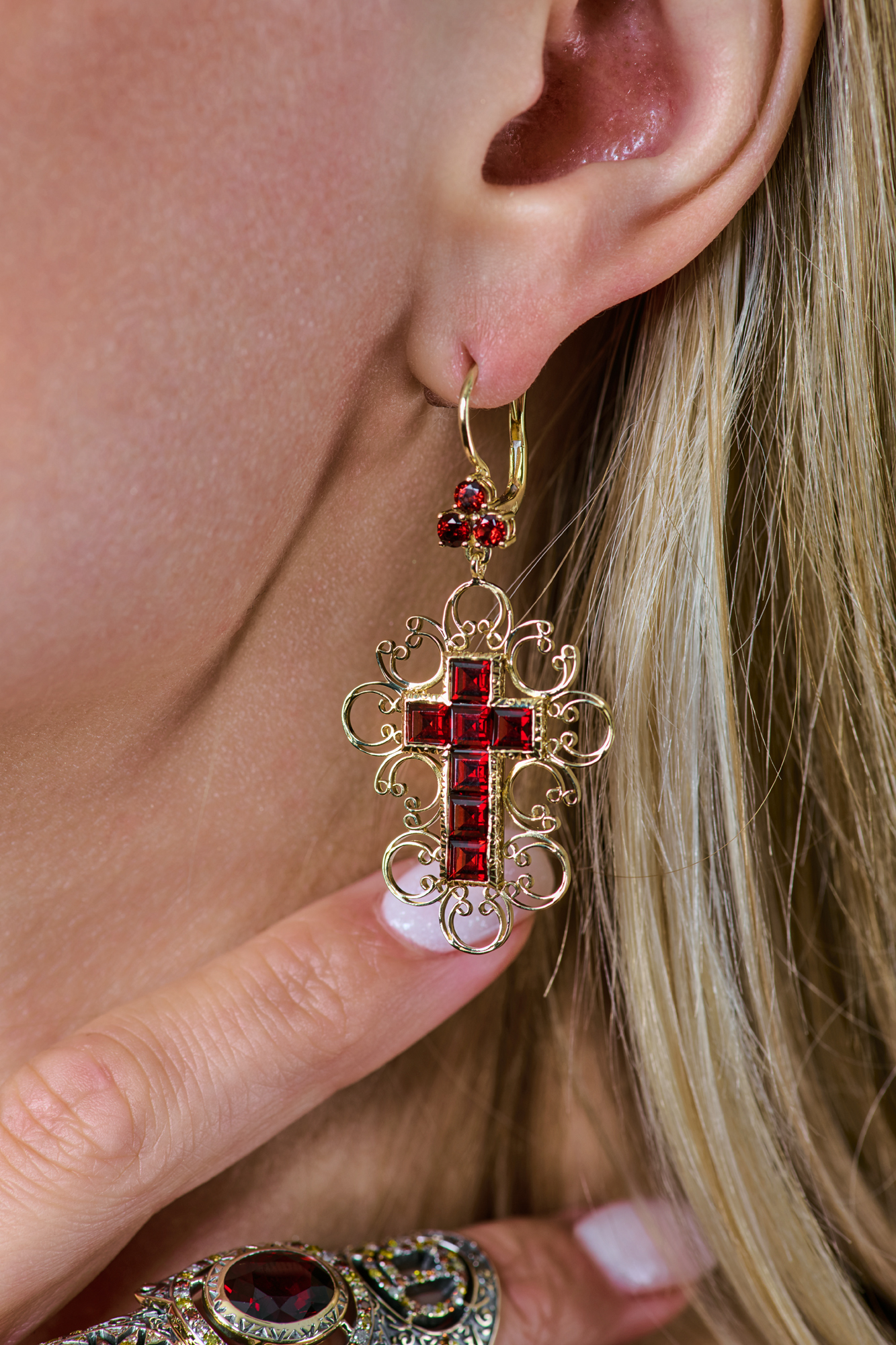 Серьги Dolce & Gabbana коллекции "Barocco" выполненные из желтого золота 750 пробы с гранатами формы огранки "Принцесса" и классической формы огранки. Размер сережек 54 х 27 мм. Вес - 12,67 гр. Полный комплект.