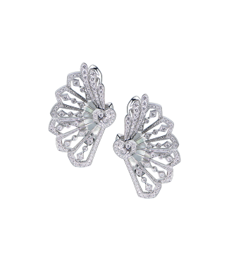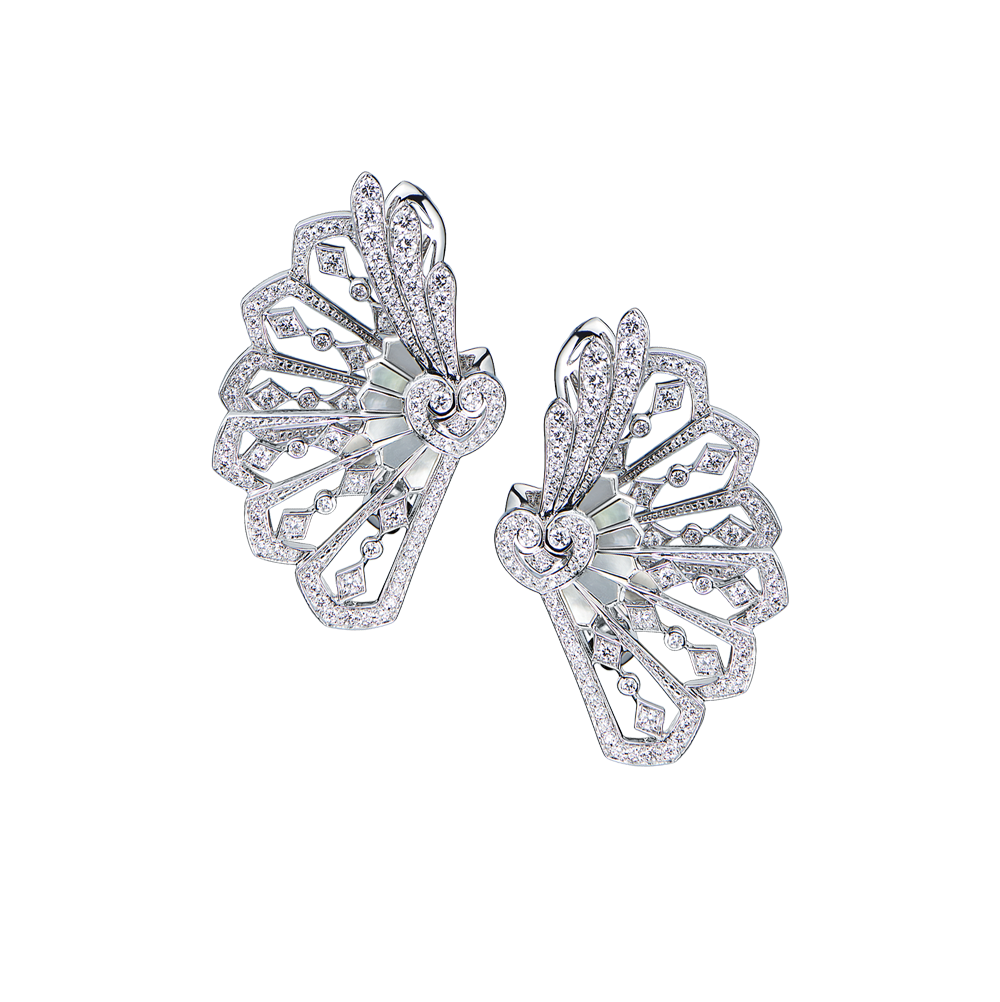 Серьги Garrard коллекции "Fanfale" выполненные из белого золота 750 пробы с 236 бриллиантами классической формы огранки общей массой 1,80 ct. Вставки из перламутра. Размер сережек 25 х 38 мм. Вес - 18,02 гр. Полный комплект оригинальными документами.