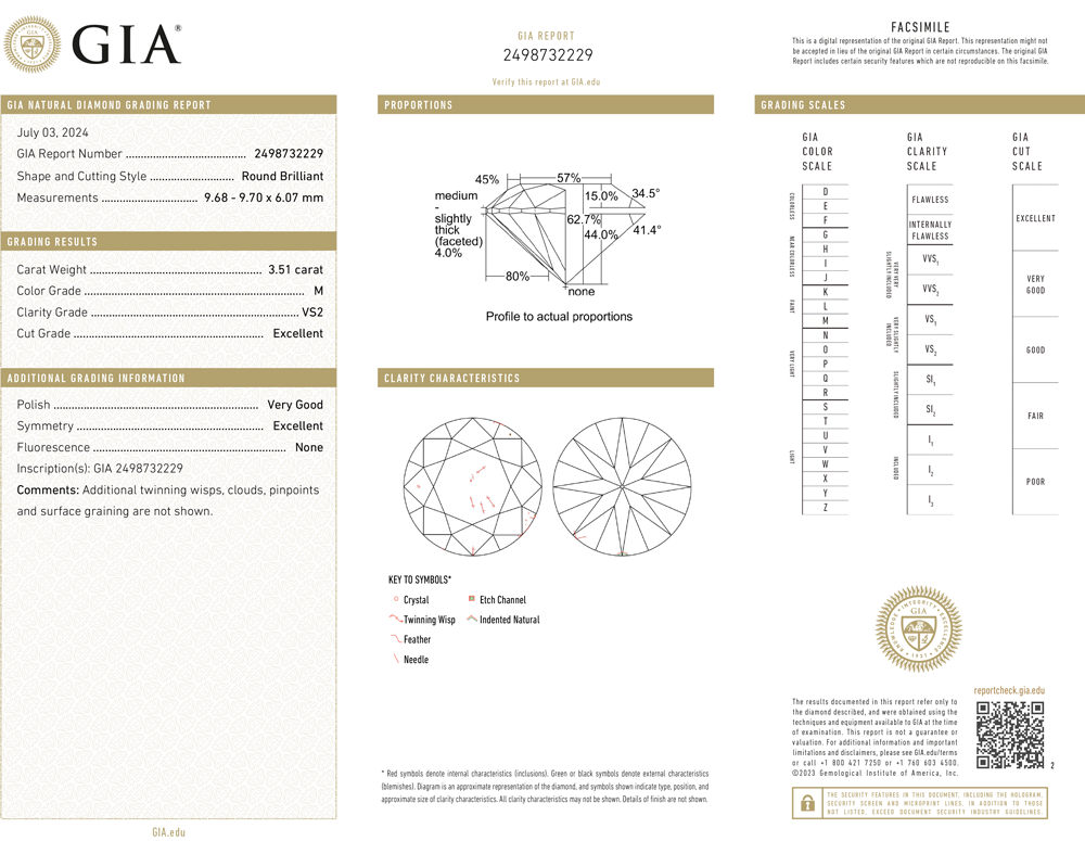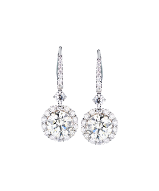 Пусеты, выполненные из белого золота 750 пробы с бриллиантами. 1 бриллиант - 3,51 ct. Форма огранки "Кр - 57". Цвет - M. Чистота - VS2. 2 бриллиант 3,61 ct. Форма огранки "Кр - 57". Цвет - M. Чистота - VS2. 44 бриллианта в обрамлении общей массой 2,66 ct. Размер 35 мм. Общий вес - 9,01 гр. В комплекте прилагаются сертификаты GIA (2183597813 и 2498732229).