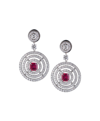Серьги GRAFF коллекции "Bullseye" выполненные из белого золота 750 пробы c бриллиантами и рубинами. 220 бриллиантов классической формы огранки общей массой 2,74 ct. Цвет Fine White. Чистота VS+. 2 рубина формы огранки "изумрудная" общей массой 1,75 ct. Размер сережек 35 х 20 мм. Полный комплект.