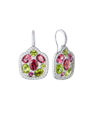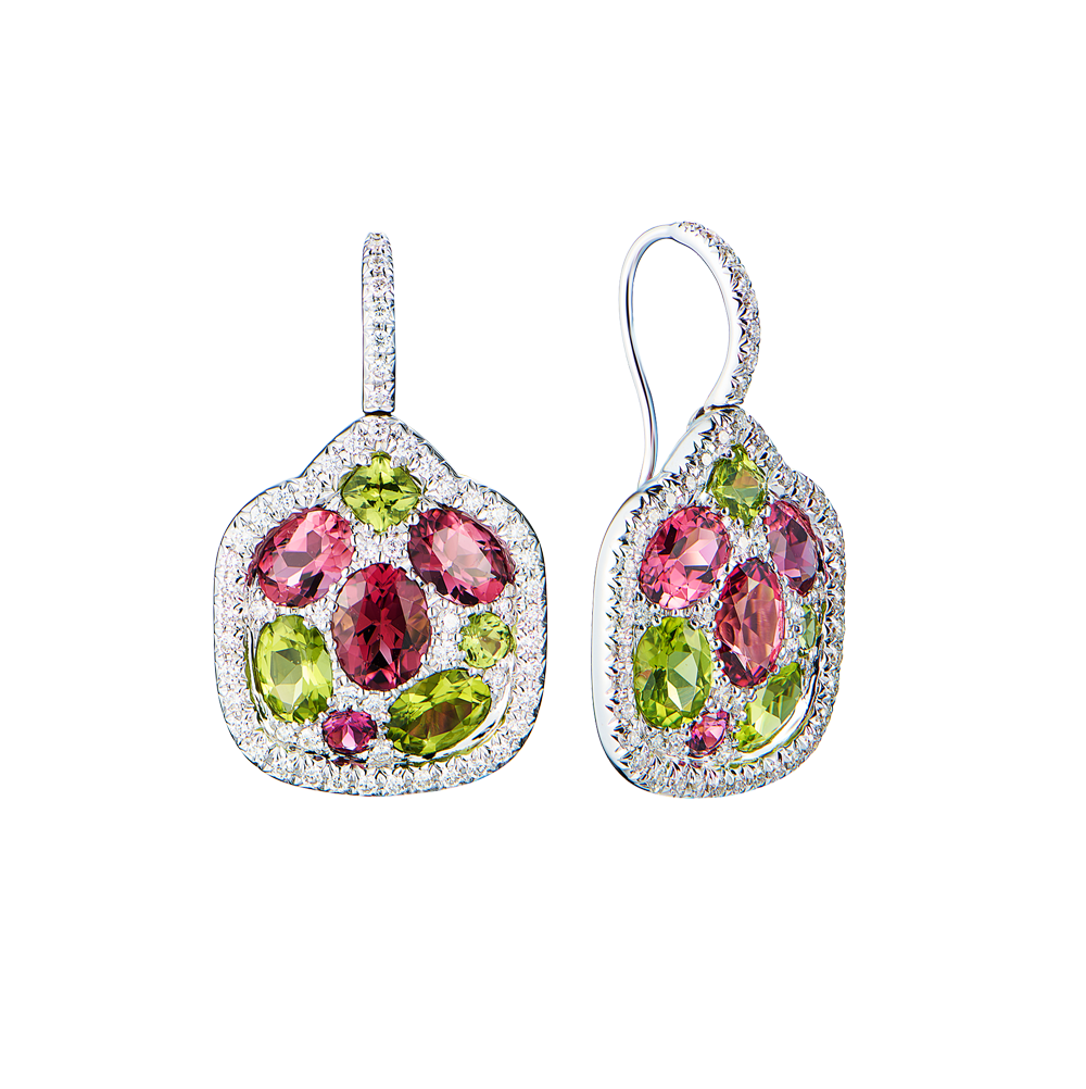 Серьги выполнены из белого золота 750 пробы с 116 бриллиантами классической формой огранки общей массой 1,26 ct. 8 турмалинами формы огранки "Овал" и "Круг" общей массой 4,10 ct. А также 8 перидотами общей массой 5,76 ct. Размер сережек 35 х 21 мм. Вес - 13,75 гр.