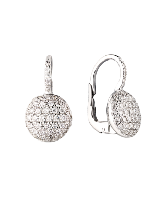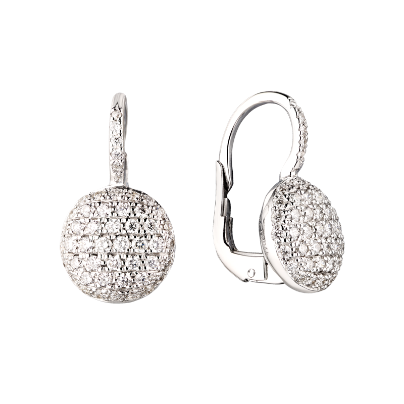 Серьги выполненные из белого золота 750 пробы с 96 бриллиантами классической формы огранки "Кр-57". Цвет 3 (G-H). Чистота 4-5 (VS1-SI1). Размер 10 х 19 мм. Общий вес - 5,86 гр. В комплекте прилагается геммологического центра МГУ.