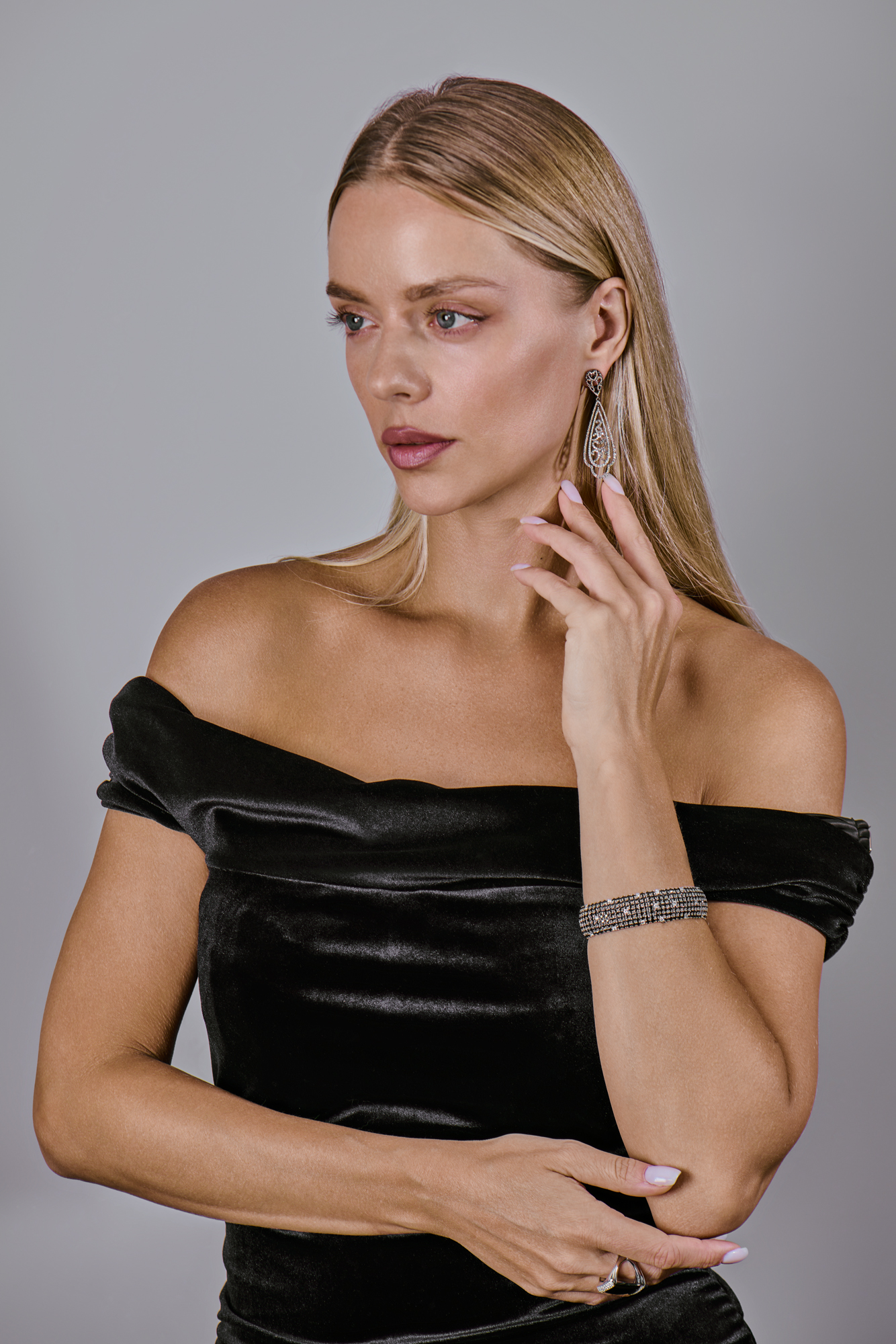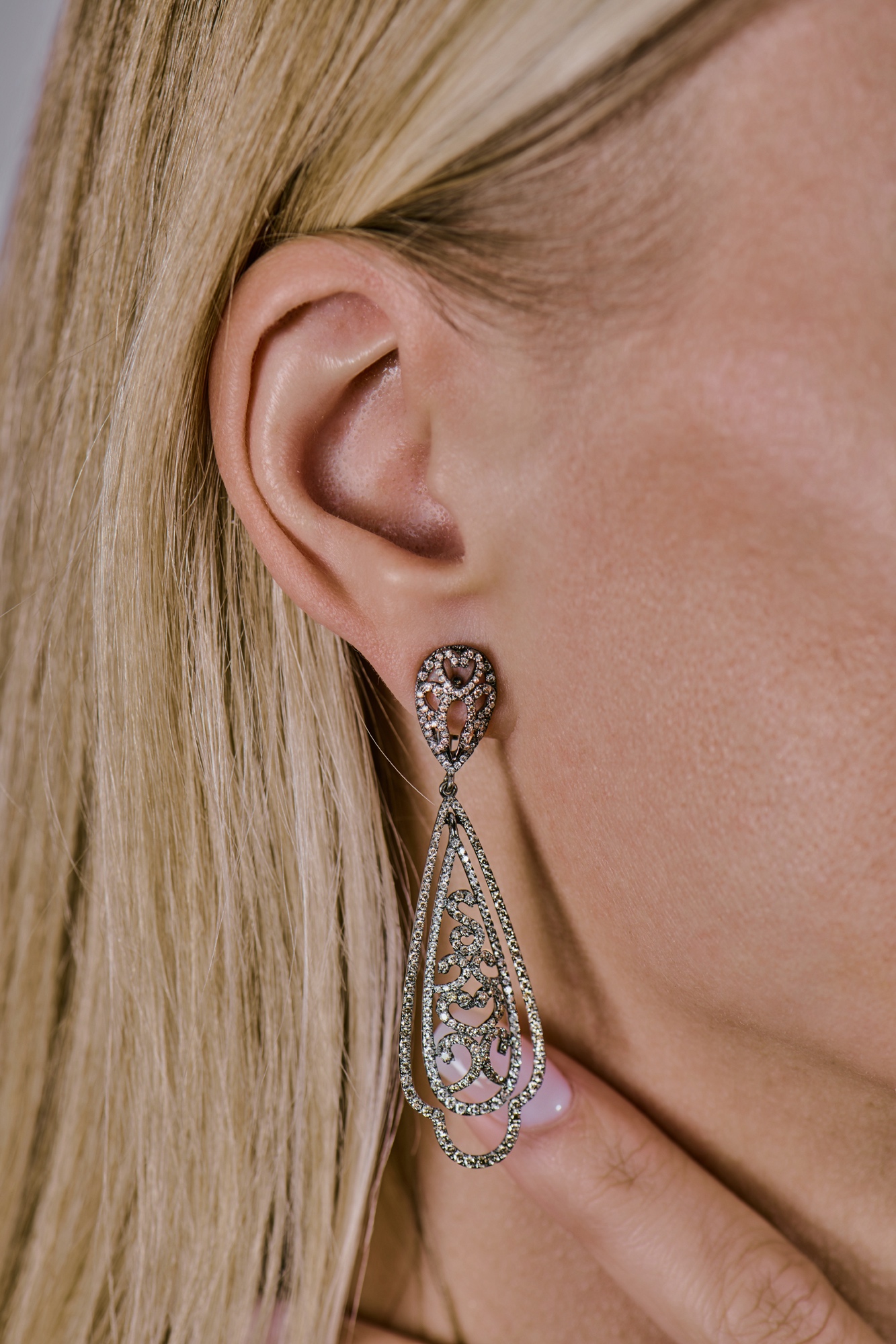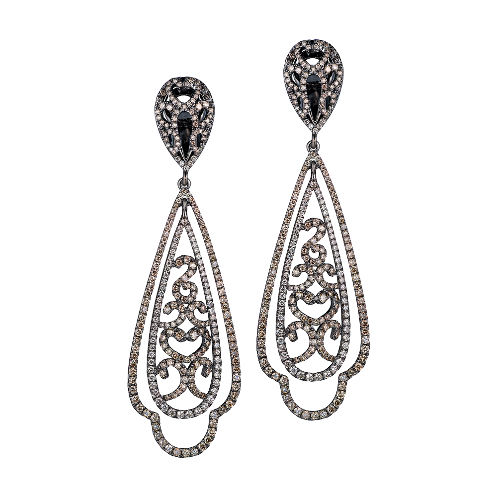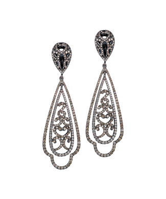 Серьги выполненные из черненого белого золота 750 пробы с белыми и коньячными бриллиантами классической формы огранки общей массой 1,06 ct. Размеры 61 х 19 мм. Вес - 12,12 гр.