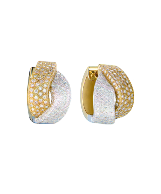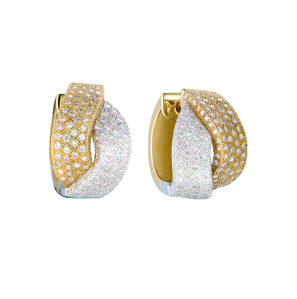 Серьги выполненные из желтого и белого золота 750 пробы с паве из бриллиантов классической формы огранки общей массой 1,15 ct. Диаметр - 20 мм. Ширина 15 мм. Вес - 15,72 гр.