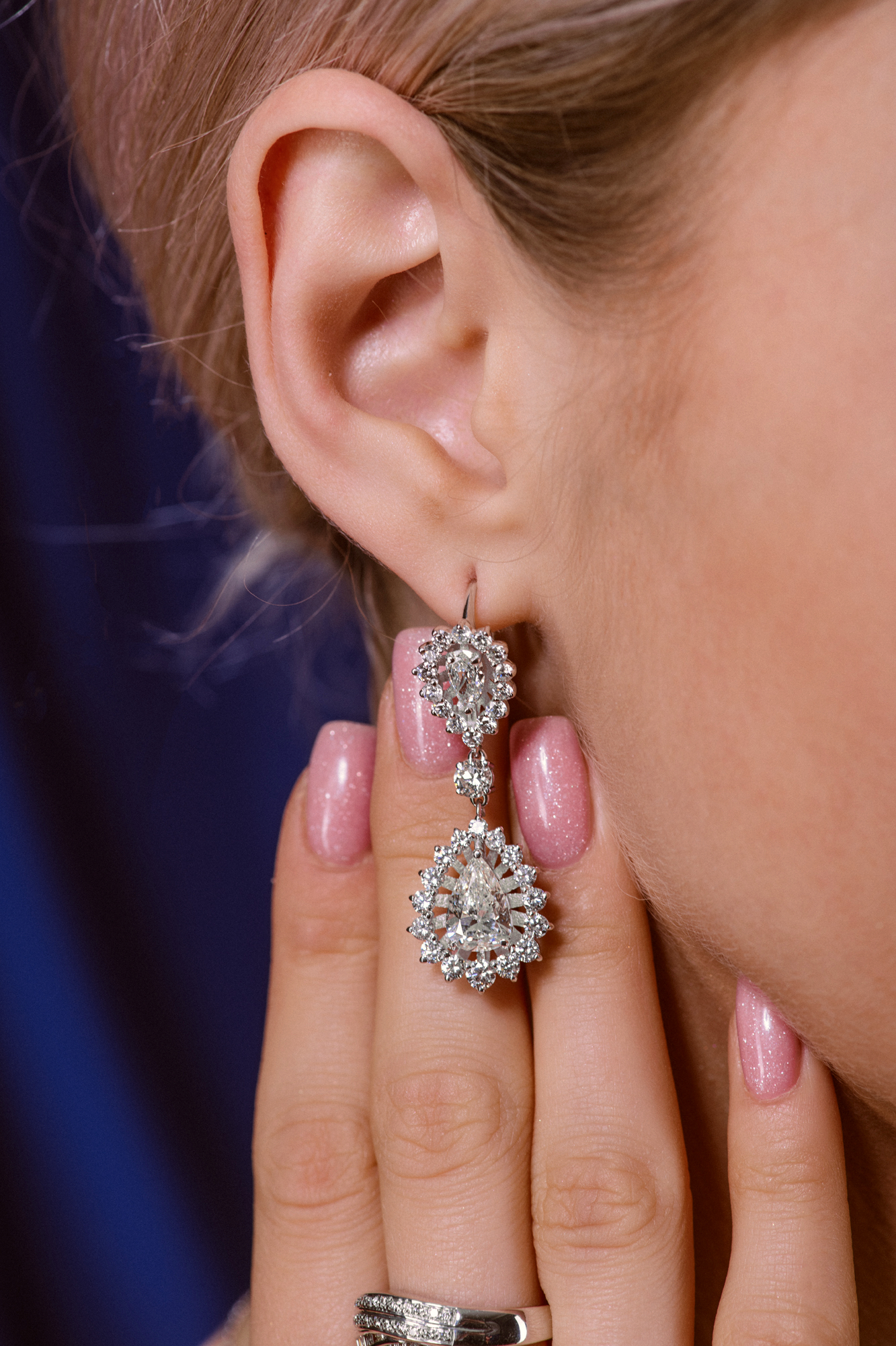 Серьги выполненные из белого золота 750 пробы с бриллиантами формы огранки "Груша" и классической круглой формы "Кр-57". 4 бриллианта формы огранки "Груша" 2,28 ct, 2,01 ct, 0,72 ct, и 0,60 ct., Цвета F-H. Чистоты SI1-SI2. 60 бриллиантов классической формы огранки общей массой 3,25 ct. Цвет G-H. Чистота VS-I1. Размеры 40 х 15 мм. Вес - 11,41 гр. В комплекте сертификат Московского геммологического центра MGC. (КЛМ)