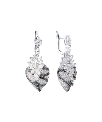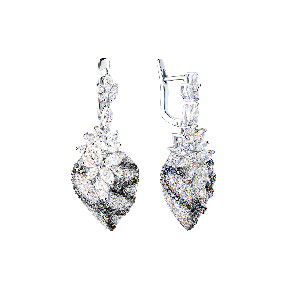 Серьги выполненные из белого золота 750 пробы с белыми и черными бриллиантами. 88 бриллиантов классической формы огранки общей массой 1,05 ct, 30 бриллиантов формы огранки "Маркиз" общей массой 3,10 ct., и 96 черными бриллиантами классической формы огранки общей массой 0,75 ct. Размер сережек 39 х 16 мм. Вес - 15,25 гр. В комплекте прилагается экспертное заключение Геммологического центра МГУ.