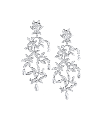 Серьги выполненные из белого золота 750 пробы с бриллиантами. 264 бриллиантов классической формы огранки "Кр-57" общей массой 3,60 ct. Цвет 3 (G-H). Чистота 4-5 (VS2-SI1). 8 бриллиантов формы огранки "Бриолет" общей массой 3,50 ct. Размер сережек 65 х 25 мм. Вес - 19,69 гр. В комплекте прилагается экспертное заключение геммологического центра МГУ.