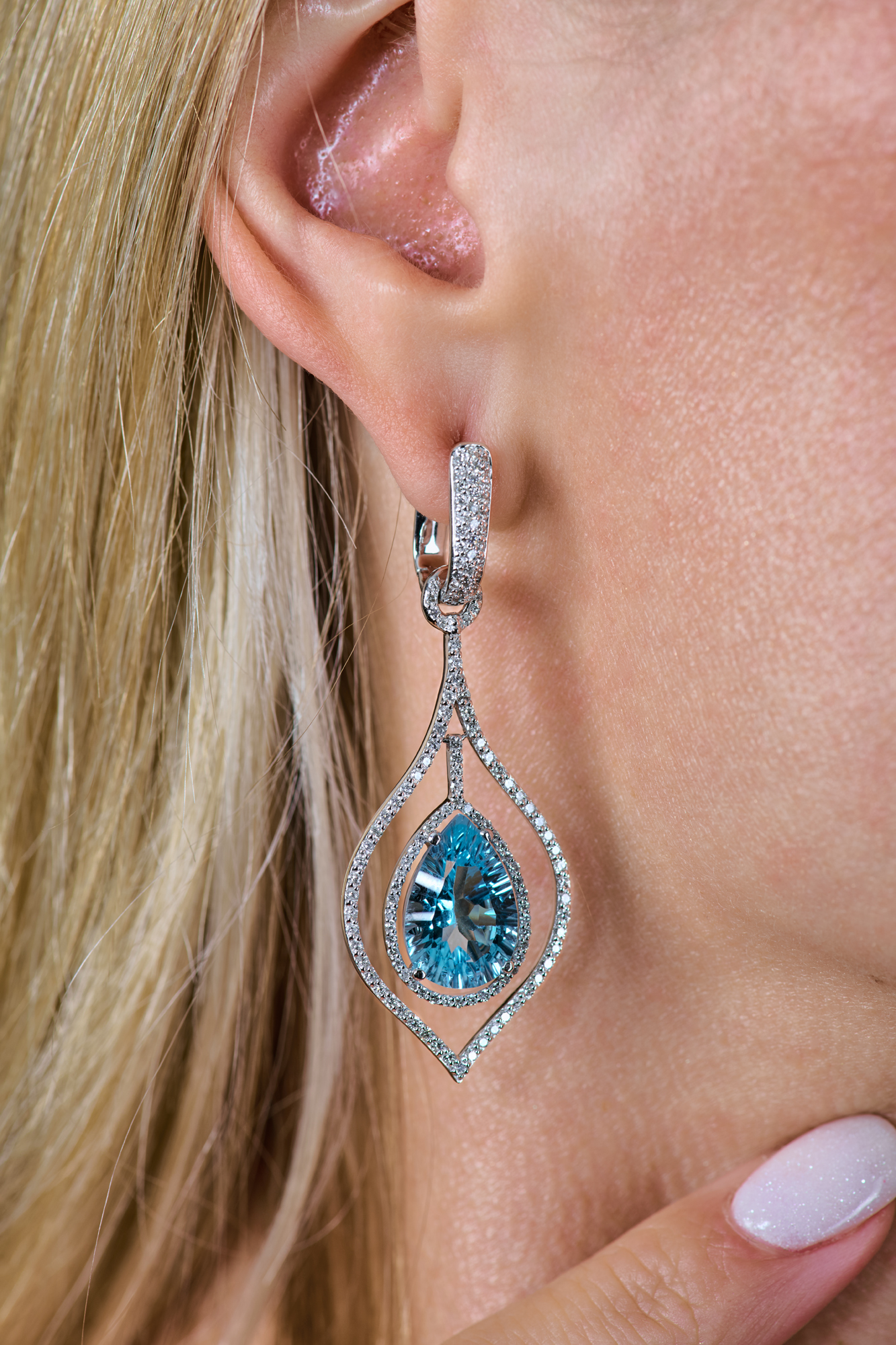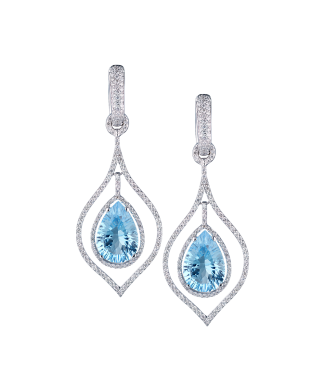 Серьги выполненные из белого золота 585 пробы с двумя топазами массой по 6,50 ct., формы огранки "Груша" в обрамлении паве из бриллиантов классической формы огранки общей массой 1,05 ct. Размер сережек 55 х 20 мм. Вес - 14,32 гр.