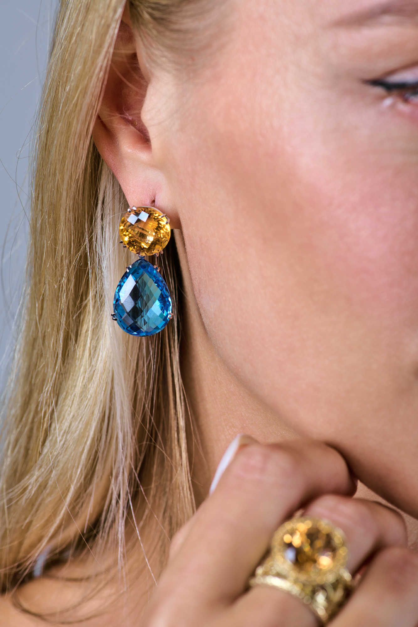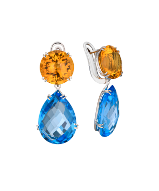 Серьги из белого золота 585 пробы с вставкой из двух круглых оранжевых цитринов массой по 8,0 ct каждый, а также двух синих топазов формы огранки "груша" массой по 14,0 ct каждый. Длина сережек 35 мм. Вес - 15,20 гр.