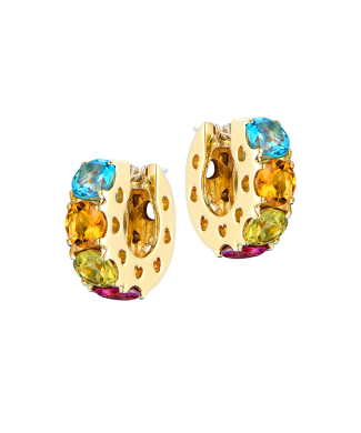 Серьги - кольца выполненные из желтого золота 750 пробы с розовыми турмалинами, перидотами, цитринами и голубыми топазами формы огранки "Круг". Диаметр 18 мм. Вес - 14,36 гр.