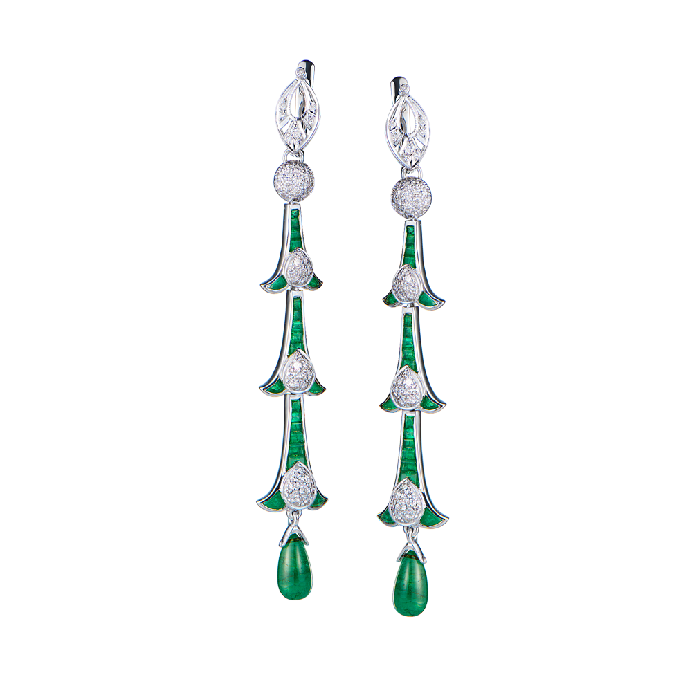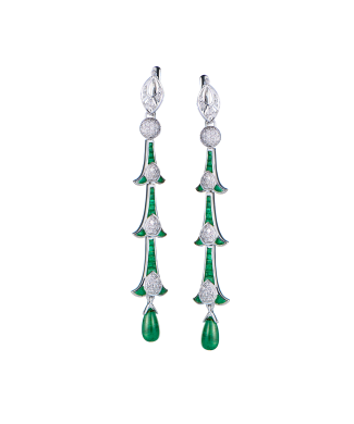 Серьги выполненные из белого золота 750 пробы с изумрудами и бриллиантами. Изумруды форм огранки "Багет", "Триллиант" и "Кабошон". И 96 бриллиантов классической формы огранки "Кр-57" общей массой 1,15 сt. Длина сережки - 8 см. Вес - 14,25 гр.