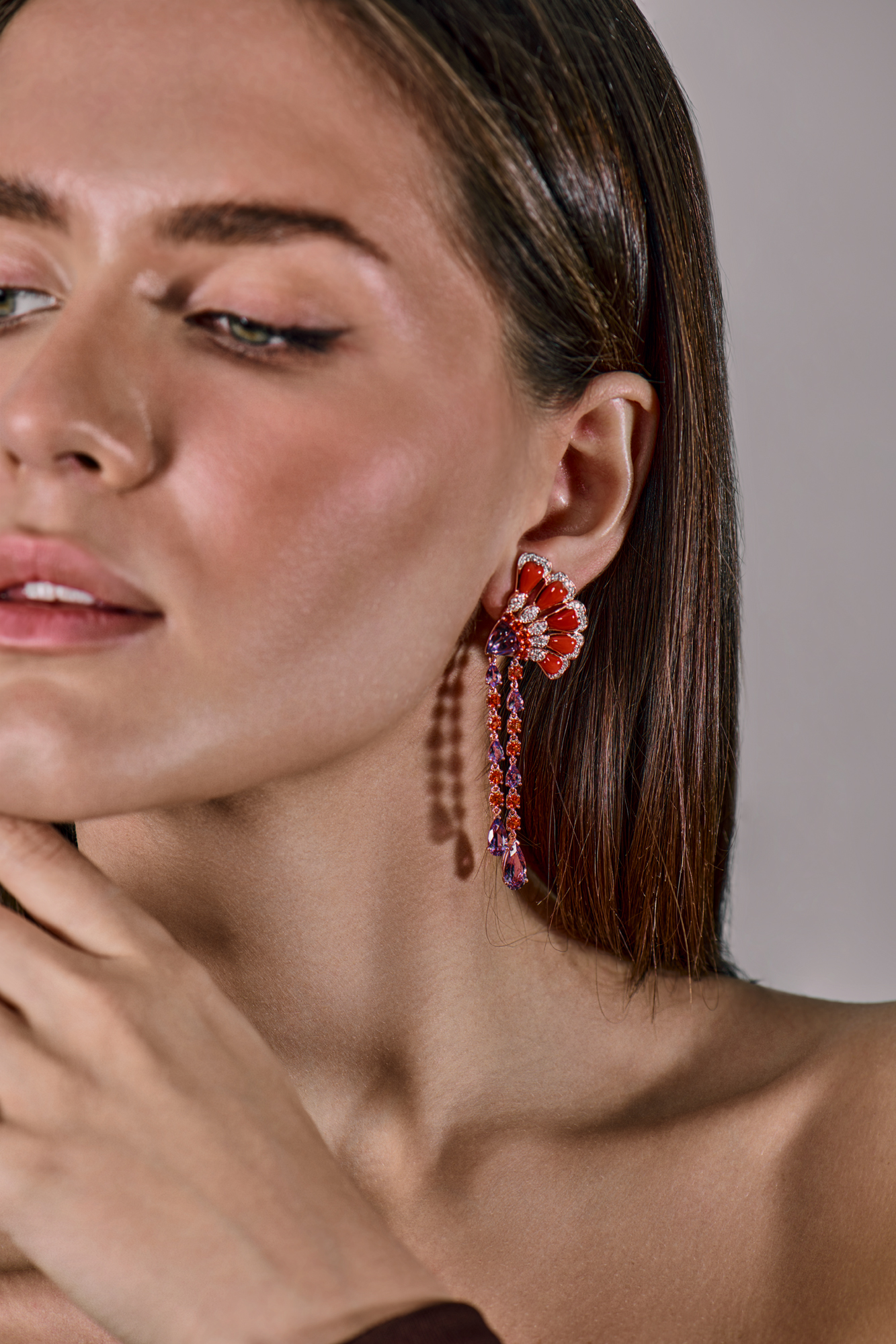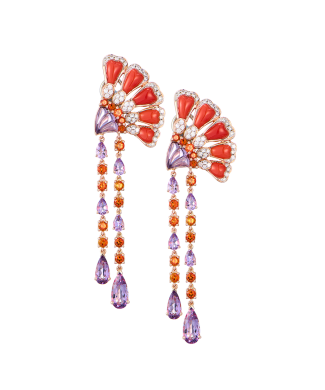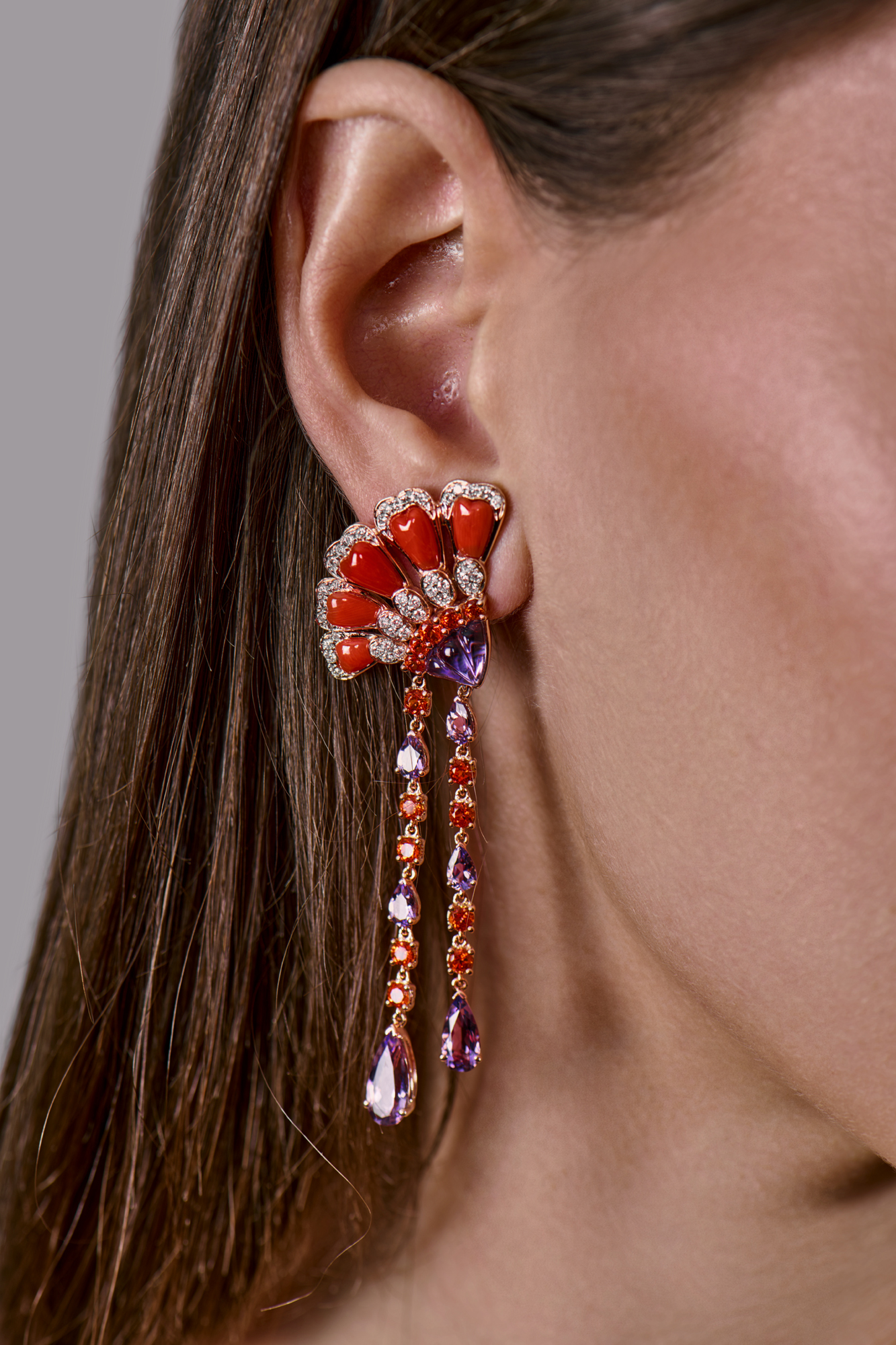 Серьги "Peacock " выполнены из розового золота 585 пробы с 86 бриллиантами классической формой огранки общей массой 0,50 ct. А также с аметистами, кораллами и мандариновыми топазами разных форм огранки. Размер сережек 78 х 20 мм. Вес - 21,95 гр.