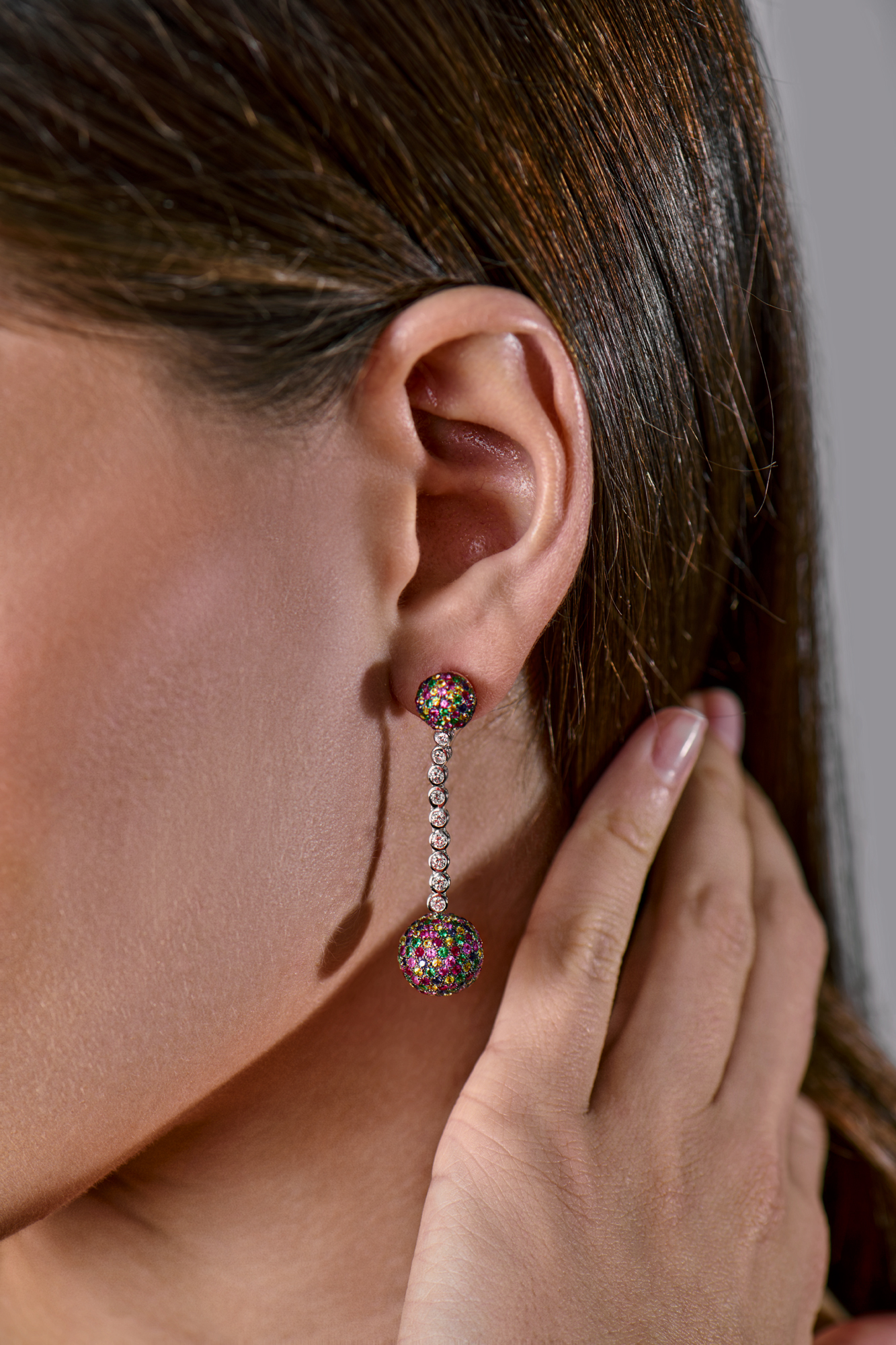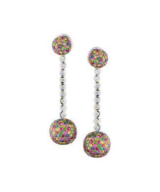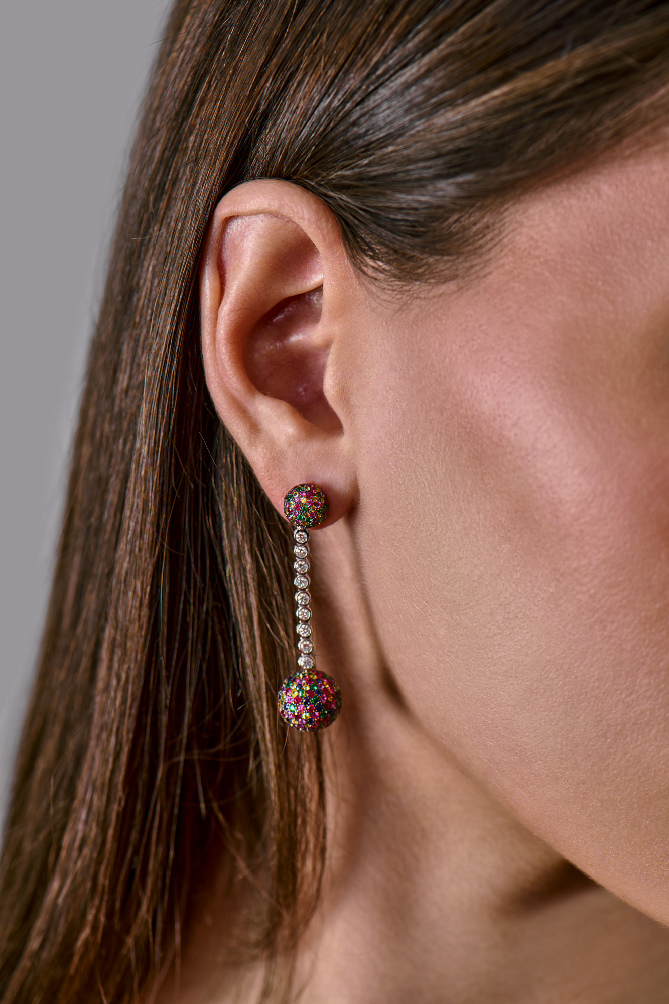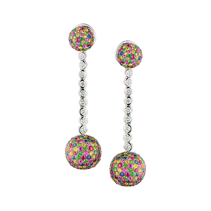 Серьги в стиле De Grisogono коллекции "Boule Collection" выполненные из белого золота 750 пробы с белыми бриллиантами, разноцветными сапфирами и зелеными турмалинами классической формы огранки. Длина сережек - 47 мм. Вес - 13,18 гр.