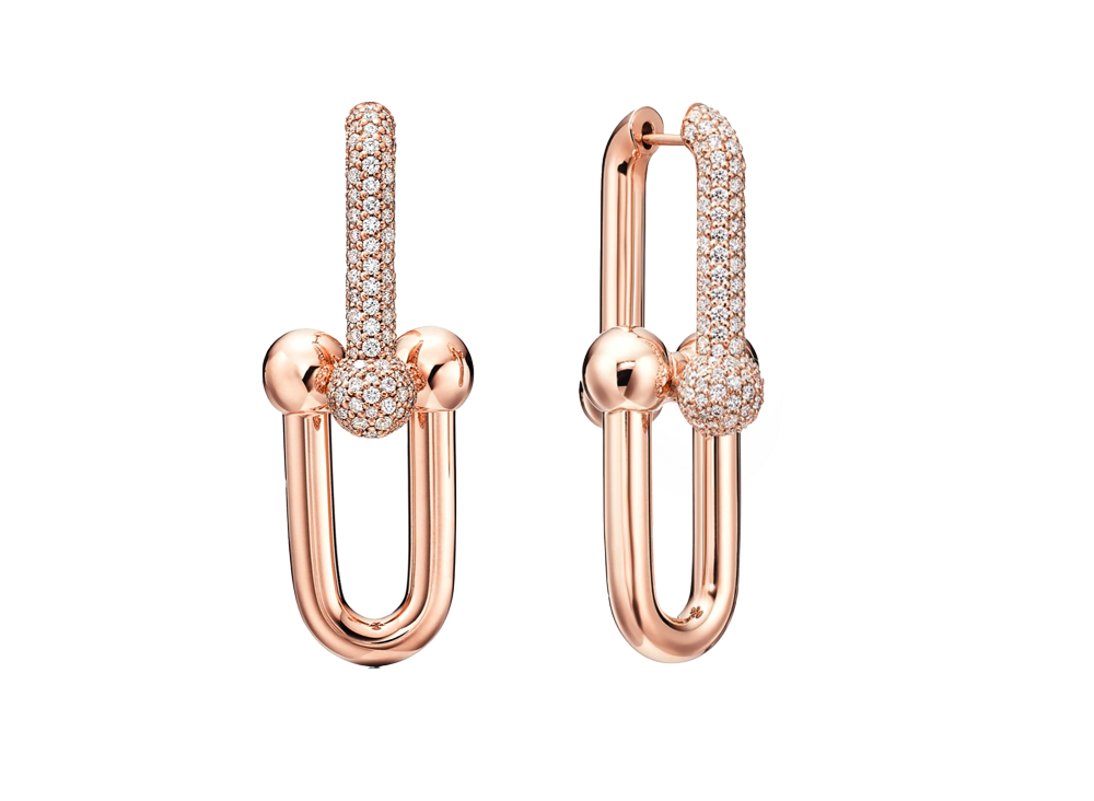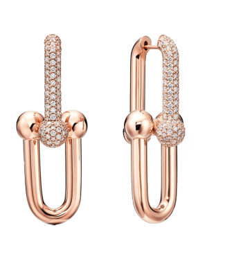 Серьги в стиле Tiffany коллекции "HardWear" выполненные из розового золота 750 пробы с паве из бриллиантов классической формы огранки общей массой 1,18 ct. Длина сережек 36 мм. Вес - 15,42 гр.