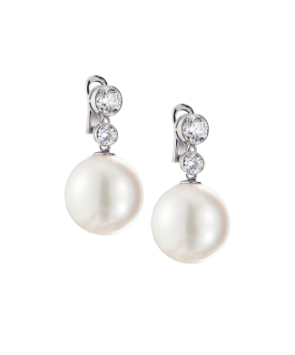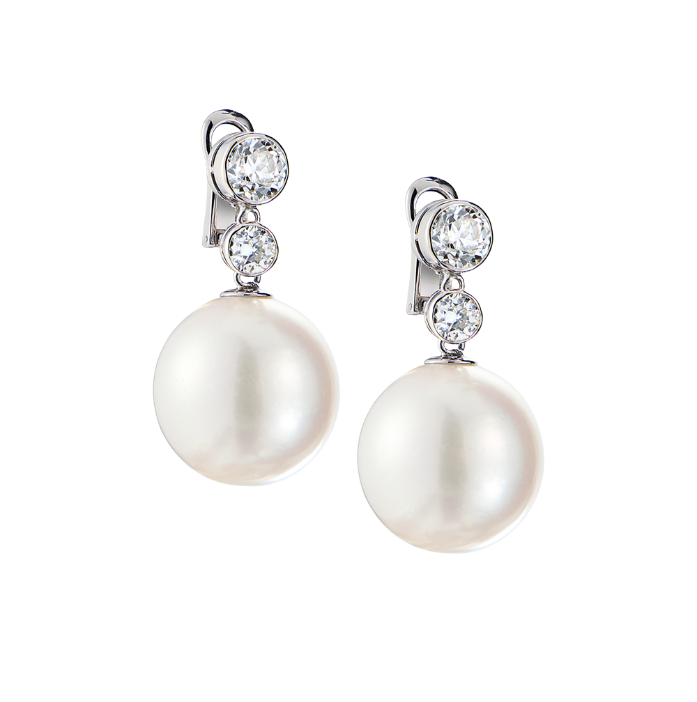 Серьги RalfDiamonds выполненные из белого золота с натуральным морским жемчугом диаметром 18,5 - 18,30 мм., и 4 бриллиантами классической формы огранки "КР-57" общей массой 3,6 ct (H-I/SI1). Размер 50 х 35 мм. Вес - 23,59 гр. В комплекте экспертное заключение Геммологического центра МГУ.