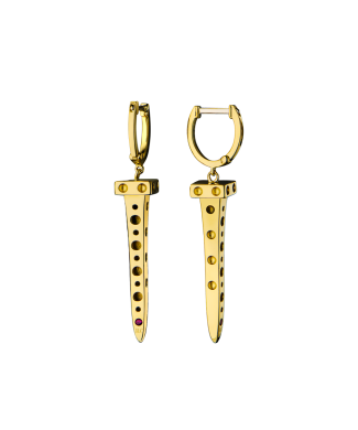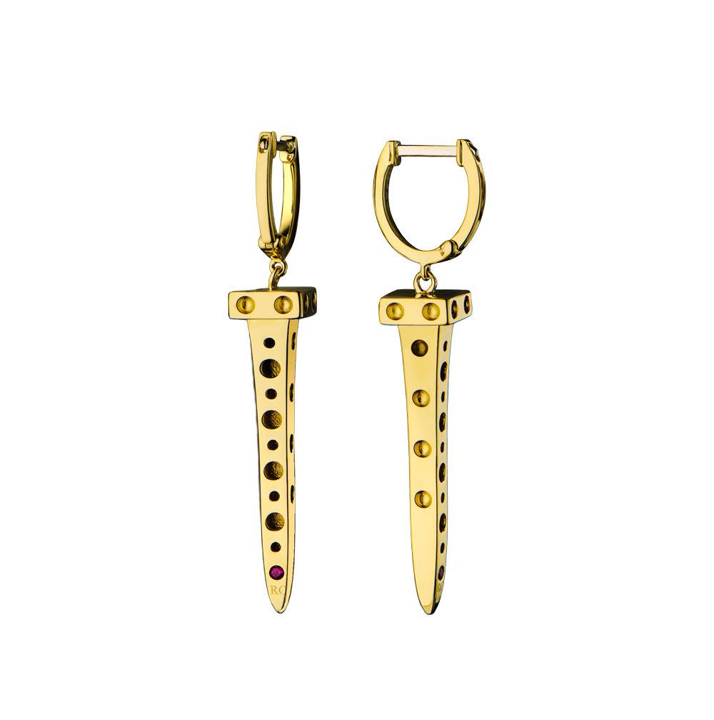 Серьги Roberto Coin коллекции "Pois Mois Chiodo" выполненные из желтого золота 750 пробы с 2 рубинами. Украшены мотивом «шляпка гвоздя» с небольшими вырезанными вручную углублениями. Термин «chiodo» в переводе с итальянского означает «гвоздь». Размер 30 мм. Вес - 7,72 гр.