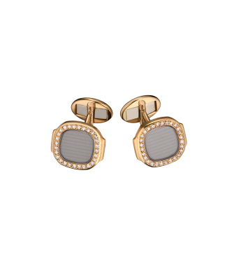 Запонки Patek Philippe из коллекции Nautilus выполненные из желтого золота 750 пробы с вставкой из серого кристалла сапфира по центру, с 64 бриллиантами классической формы огранки общей массой 1,00 ct. Размер 14,5 х 16 мм. Вес - 17,57 гр. Подарочный вариант!
