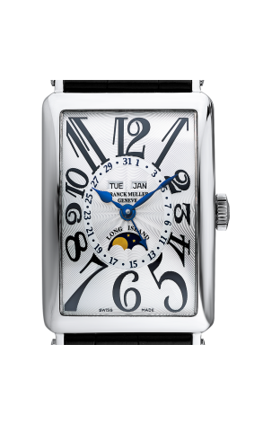 Ref.: 1200 MC L; Тип: Швейцарские часы; Кому: Мужские; Состояние: Б/У; Бренд: Franck Muller; Тип часов: С усложнениями; Модель: Long Island Master Calendar; Комплектация: Отсутствует; Материал корпуса: Белое золото; Материал ремешка: Кожаный; Размер: 33 x 45мм; Тип механизма: Автоподзавод; Стекло: Сапфировое; Состояние : Отличное ; Функции: Индикатор фазы Луны, Дата, Индикатор дней недели, Индикатор месяца;