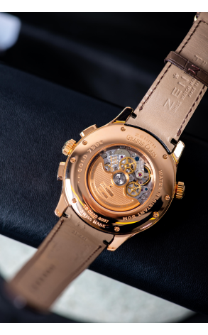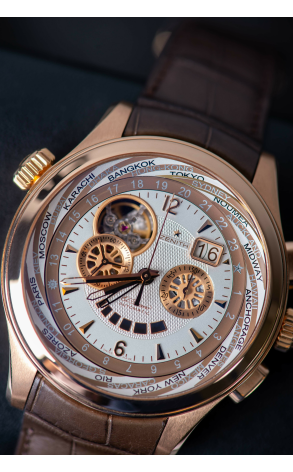 Ref.: 18.0520.4037/02.C661; Тип: Швейцарские часы; Кому: Мужские; Состояние: Б/У; Бренд: Zenith; Тип часов: С усложнениями; Модель: El Primero; Комплектация: Отсутствует; Материал корпуса (м): Розовое золото; Материал ремешка: Кожаный; Размер: 46 мм; Тип механизма: Автоподзавод; Стекло: Сапфировое; Водонепроницаемость: 50 метров; Функции: Время 24-х городов мира, Дата, часы, минуты, секунды, Запас хода, Указатель день/ночь;