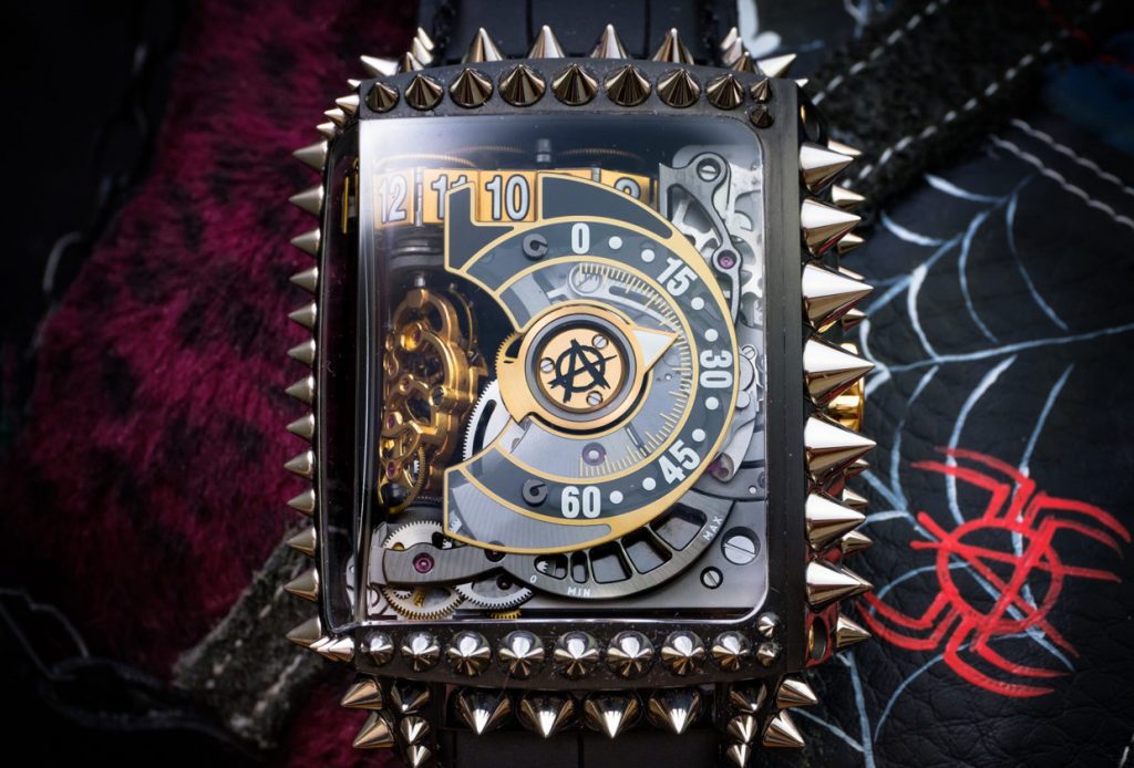 Hautlence, у которых и так был статус “непослушного ребёнка“ в часовом деле, вышли на новый уровень бунтарства, выпустив часы HL2.3 Punk. Переделав фирменный корпус с калибром HL2.0 и тремя сапфировыми стёклами, вырезанными из цельных блоков, Hautlence сделали необычный шаг: наклеили на часы 84 шипа 14-ти разных размеров. Они символизируют принадлежность к панк-культуре. Вдохновлённые легендарными Perfecto jacket,Hautlence тоже решили изобразить свободу личности, смешав жанры, чтобы создать элитные часы, которые будут ярко выделяться на фоне других. Над регулятором скорости, который отвечает за плавный ход цепи с указанием времени, Hautlence поместили традиционную ленту Мёбиуса и букву А в круге — знак либерального движения, который символизирует абсолютную свободу, отрицание любой власти и неравенства.